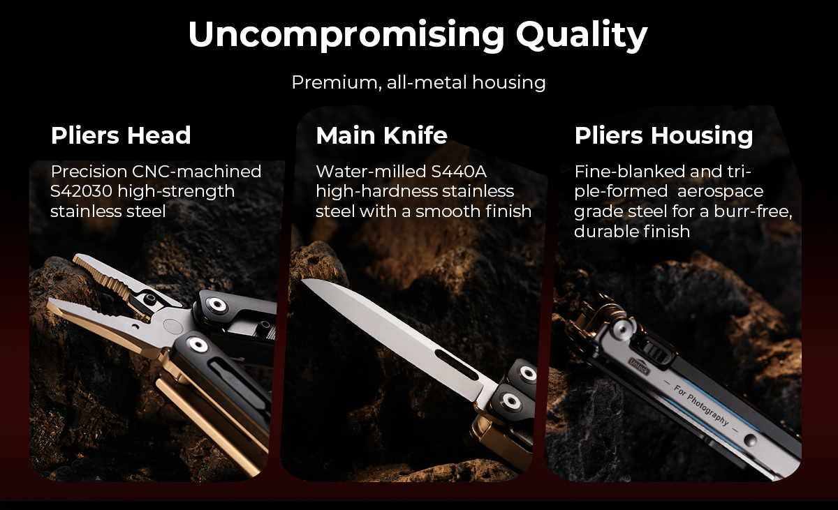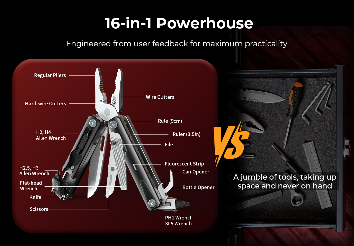 Vsako orodje ima varnostno zaporo za varno in nadzorovano delovanje, medtem ko zunanja orodja (nož, pilica, ključ) omogočajo hitro uporabo z eno roko.