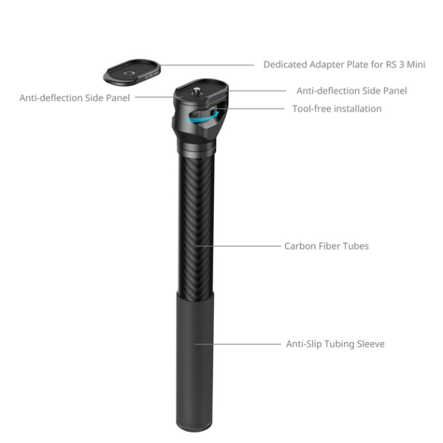 Podaljšek SmallRig za stabilizatorje DJI je posebej zasnovan za modele RS 4, RS 3 in RS 2 ter ponuja varno in lahko rešitev za namestitev dodatne opreme. Izdelan je iz ogljikovih vlaken, zato zagotavlja vzdržljivost brez dodatne teže. Protizdrsni ročaj z oblazinjenjem poveča stabilnost, kar olajša doseganje natančnih posnetkov z različnih kotov.
