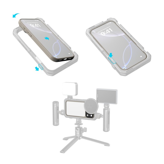 Ima sistem za hitro snemanje zadnje plošče objektiva, ki vključuje zadnje plošče objektiva T-Mount in 67-milimetrske pritrdljive adapterje za filtre za hitro menjavanje objektivov in magnetnih filtrov. Ohišje je izdelano iz mehkega TPU materiala, ki zagotavlja udoben oprijem in hkrati nudi osnovno zaščito za vogale in robove telefona.