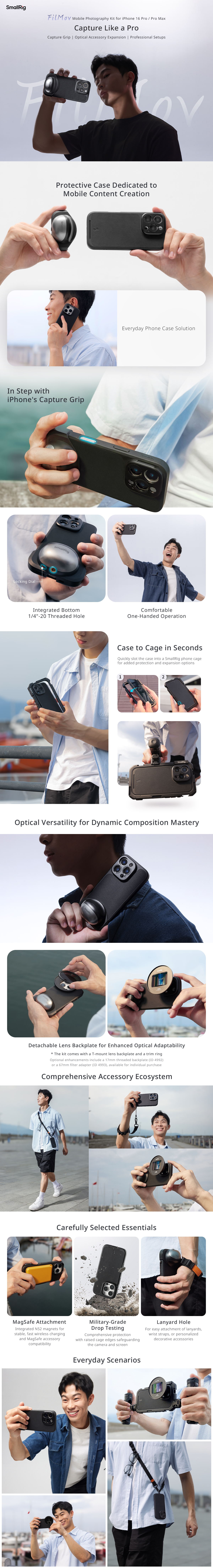 SmallRig FilMov Lightweight Photography Case Kit za iPhone 16 Pro Max 4987 je prefinjeno zaščitno ohišje za mobilne naprave, zasnovano za ustvarjanje mobilnih vsebin, ki je brezhibno združljivo z optičnim ekosistemom. Izdelan z vrhunskim usnjenim materialom in natančnimi tehnikami brizganja, se ponaša z izvrstnim videzom, ki izboljša uporabnikovo čutno izkušnjo. Ergonomski CapGrip za spodnji del telefona, zasnovan za boljši oprijem in nadzor gumba za zajemanje, zagotavlja udobno upravljanje z eno roko, kar uporabnikom omogoča lahkotno zajemanje trenutkov z večjo stabilnostjo. Ročaj CapGrip je opremljen z gumbom za zaklepanje za varno pritrditev na ohišje telefona in ima tudi luknjo z navojem 1/4"-20 za enostavno namestitev na podporna stojala in stative.