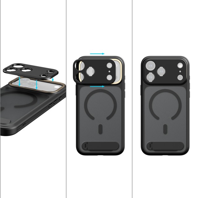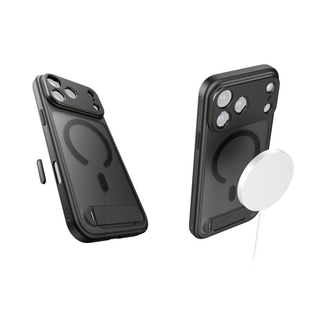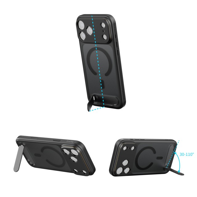 Ohišje je zasnovano za optimalno funkcionalnost in je natančno poravnano z gumbom za nadzor kamere iPhone, kar zagotavlja občutljivo taktilno povratno informacijo in hkrati zagotavlja celovito zaščito. Vgrajena večkotna podpora (30°-110°) omogoča enostavno prehajanje med pokončno in ležečo usmeritvijo. Vgrajeni magneti MagSafe zagotavljajo univerzalno združljivost z dodatki MagSafe, stranska luknja za vrvico pa omogoča pritrditev zapestnih ali ramenskih trakov za udobno prenašanje na poti.