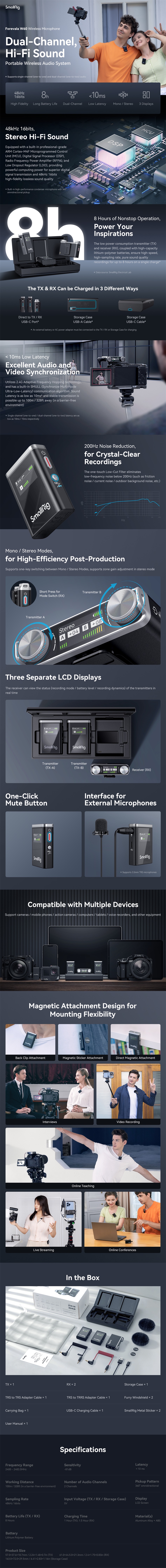 SmallRig Forevala W60 je brezžični mikrofon 2,4G z nizko latenco, ki je nujna oprema za fotografske in video navdušence. Opremljen je z vrhunskim DSP za obdelavo šumov in zvoka ter podpira naprave, kot so pametni telefoni, fotoaparati, stabilizatorji, akcijske kamere, računalniki, snemalniki, videokamere, snemalna peresa in tablični računalniki, ter zagotavlja profesionalno kakovost snemanja.