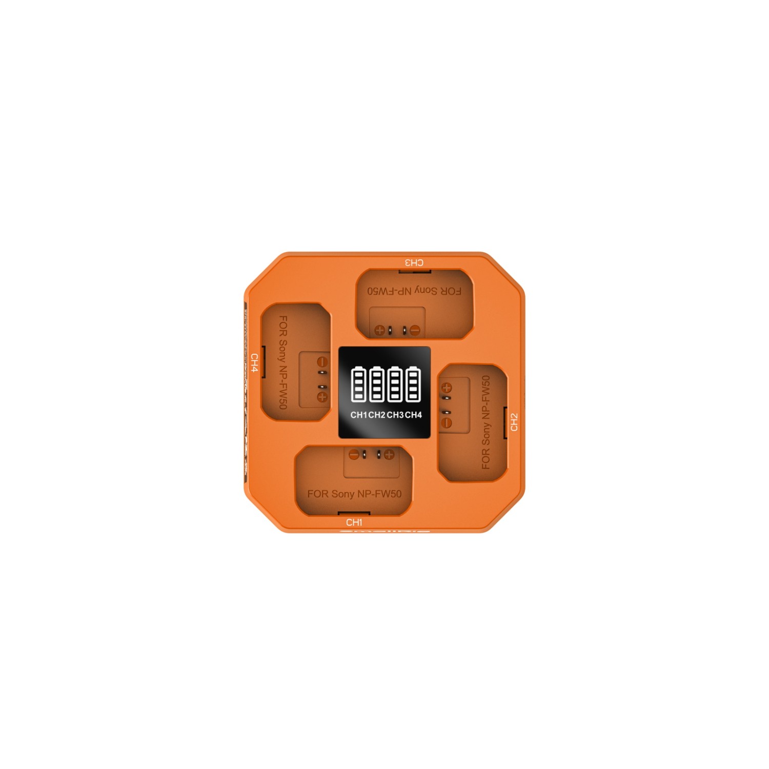 Štirje namenski kanali omogočajo hkratno polnjenje štirih baterij NP-FW50, kar zagotavlja učinkovito hitro polnjenje za zahtevne snemalne urnike.