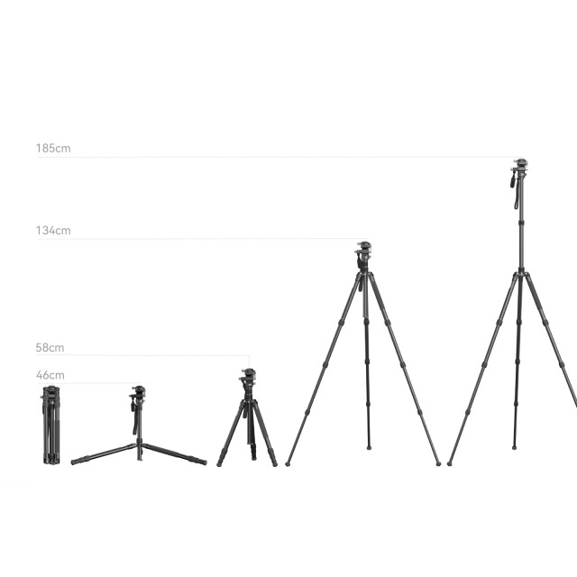 SmallRig CT195 Video Tripod Kit 4307 je natančno zasnovan za snemanje videoposnetkov, pretakanje v živo, vloganje itd., zlasti na prostem. Ima vzvratno zložljive noge iz aluminijeve zlitine, ki jih je mogoče zložiti do 46 cm, in sredinski stolpec za večjo stabilnost. Štirisekcijske noge z zaklepanjem z gumbom omogočajo, da delovno višino v nekaj sekundah prilagodite do 185 cm, snemljiv sredinski stolpec pa lahko obrnete za snemanje pod nizkim kotom. Če razstavite eno od nog in jo pritrdite na glavo, lahko stativ spremenite v monopod. Za hitro nastavitev kota, ki ustreza vašim potrebam, je na voljo 3-stopenjski gumb (23° / 55° / 79°). Video glava 4104 na vrhu omogoča hiter preklop med vodoravnim in navpičnim snemanjem ter smerjo pritrditve plošče za hitro sproščanje, nosilne kletke in L-objektiva. Na voljo je tudi odstranljiv teleskopski ročaj, ki je enostaven za shranjevanje in omogoča enakomerno vrtenje glave za 360° in nagibanje za +90°/-90°.