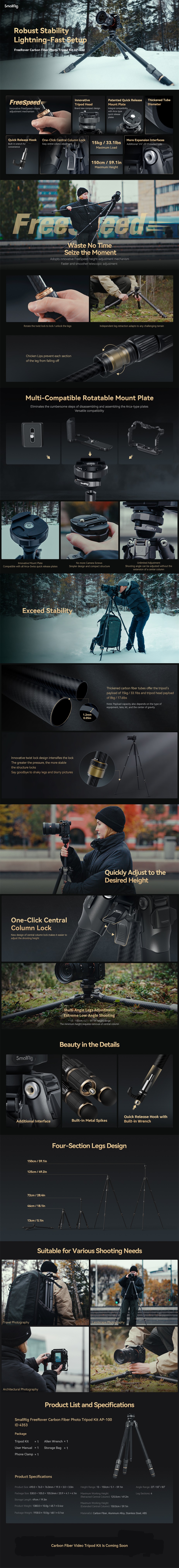 SmallRig FreeRover Carbon Fiber Photo Tripod Kit AP-100 4353 je kompakten stativ iz ogljikovih vlaken, zasnovan posebej za fotografe na poti. Noge imajo zasnovo hitrega sproščanja FreeSpeed-rotate, ki omogoča enostavno in učinkovito nastavitev z zategovanjem enega samega gumba za pritrditev vseh štirih delov. Uporaba 1,2 mm debelega materiala iz ogljikovih vlaken za noge in sredinsko stojalo zagotavlja lahko konstrukcijo brez zmanjšanja stabilnosti ali nosilnosti. Sredinski steber je opremljen z vzvodom za hitro sprostitev, ki omogoča hitro nastavitev višine. Spodnji del sredinskega stebrička je opremljen s kavljem za hitro sprostitev z imbusom, ki omogoča priročno pritrditev in odstranitev opreme za fotoaparat. Poleg tega ima sredinski steber funkcijo odstranljivega kratkega stebrička, ki zagotavlja najmanjšo višino 13 cm za snemanje iz majhnih kotov. Stativ ima obrnjeno kroglično glavo, ki zaradi svoje vdolbine omogoča kompaktnejšo in prenosnejšo zasnovo, ko je zložena.