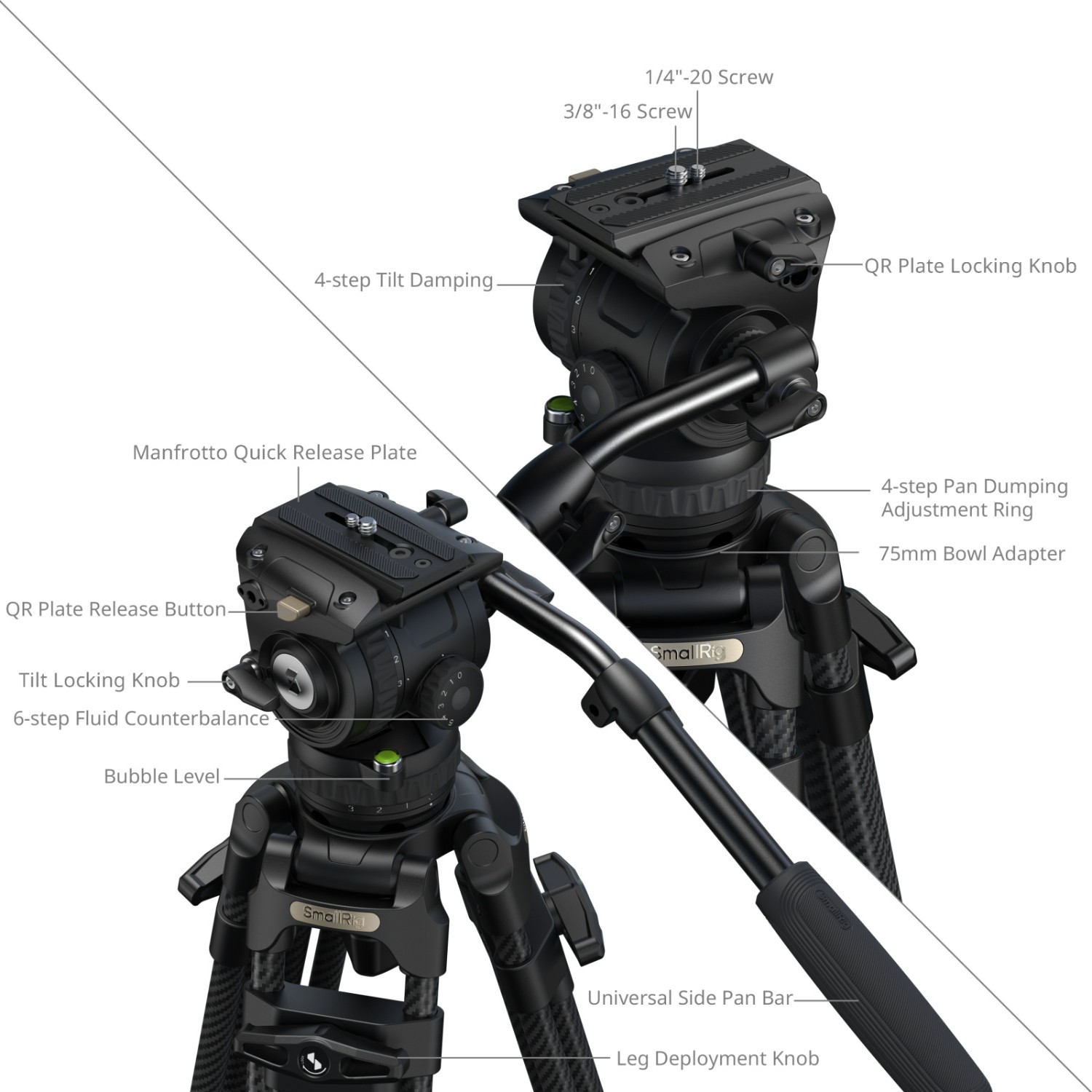 Stojalo je izdelano iz ogljikovih vlaken (Ø16 mm) v 3-delni konfiguraciji 2-2-1 in standardni 75-mm podlagi, združljivo pa je s tekočo glavo s 6-stopenjskim protiutežem in neodvisnim 4-stopenjskim nadzorom nagiba/panoramiranja. Mehanizem za uravnoteženje podpira obremenitve od 0 kg do 6 kg (0 lb do 13,2 lb), glava pa omogoča varno delovno težo 10 kg (22 lb) in maksimalno nosilnost 15 kg (33,1 lb). Delovna višina stativa je od 93,6 cm do 214 cm (36,9 in do 84,3 in), kar zagotavlja stabilnost pri visoki obremenitvi in gladko gibanje za snemanje pod visokim kotom.