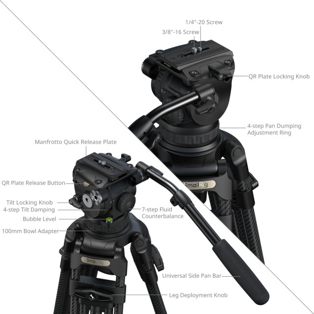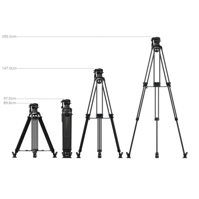 Stojalo je izdelano iz ogljikovih vlaken (Ø18 mm) v 3-delni konfiguraciji 2-2-1 in standardni 100-mm podlagi, združeno pa je s tekočo glavo s 7-stopenjskim protiutežem in neodvisnim 4-stopenjskim nadzorom nagiba/panoramiranja. Mehanizem za uravnoteženje podpira obremenitve od 4 kg do 10 kg (8,8 lb do 22 lb), glava pa omogoča varno delovno težo 15 kg (33,1 lb) in maksimalno nosilnost 17 kg (37,5 lb). Delovna višina stativa je od 89,8 cm do 200,5 cm (35,4 in do 78,9 in), kar zagotavlja stabilnost pri visokih obremenitvah in gladke posnetke gibanja, hkrati pa omogoča snemanje iz visokih kotov.