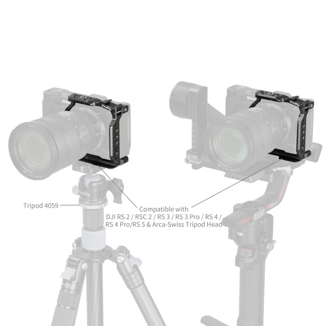 SmallRig Half Cage za Nikon ZR 5905 je zasnovan za izboljšanje razširljivosti in poenostavitev namestitve kardanskega obeska. Njegova lahka konstrukcija s polovičnim pokrovom omogoča enostavno namestitev brez odstranjevanja hitre sponke kardanskega obeska DJI RS, kar poenostavi delovanje in prihrani čas. Osnova ima vgrajeno ploščo za hitro sprostitev Arca-Swiss, ki omogoča neposredno namestitev na stative tipa Arca (ID 5290, 4222B) in gimbale DJI (RS 2, RSC 2, RS 3 Pro, RS 4 Pro) za hitre prehode med nastavitvami.