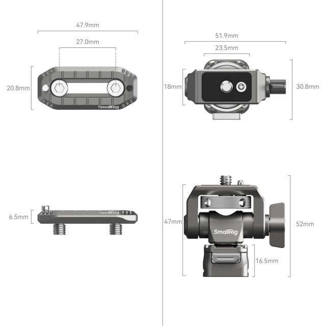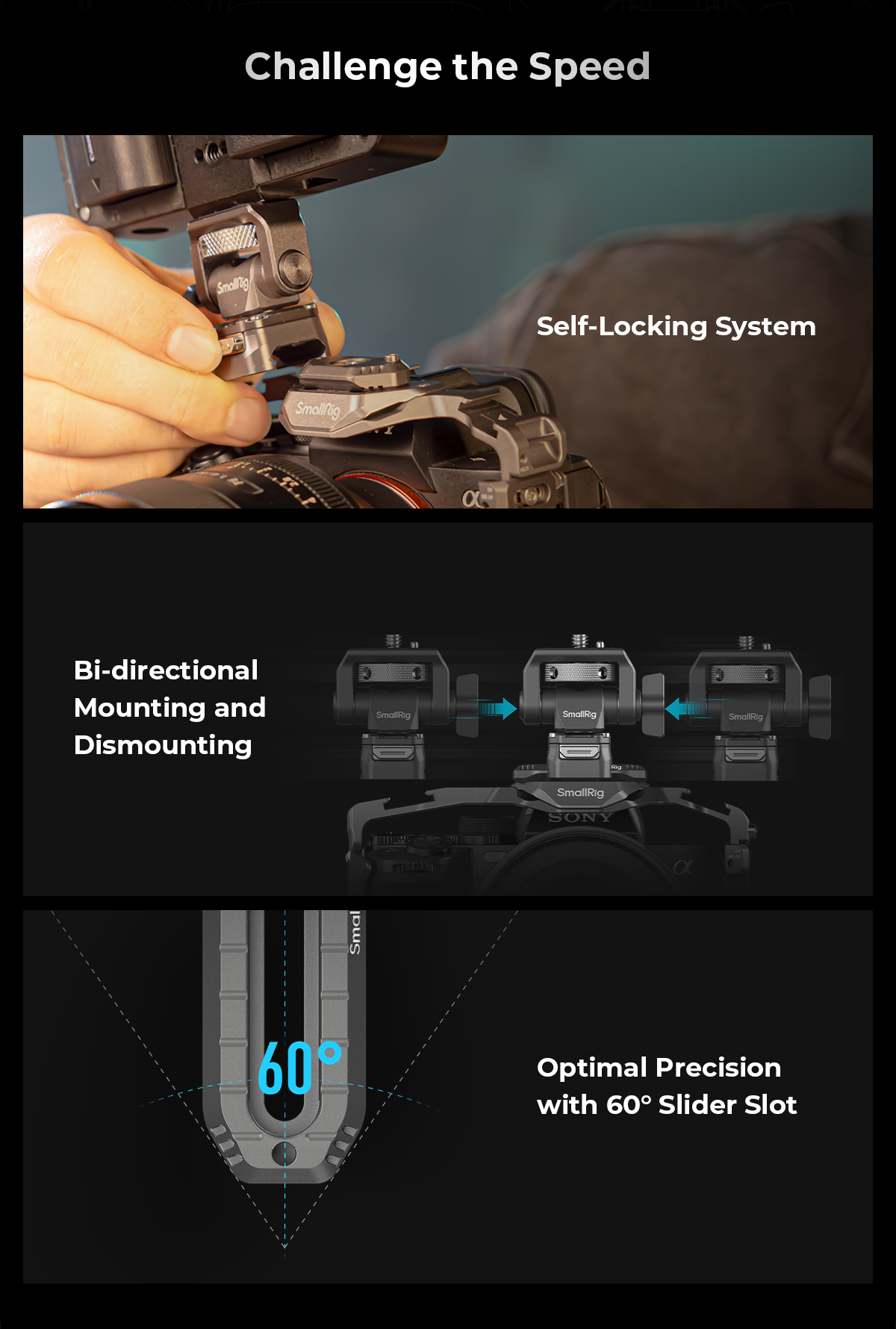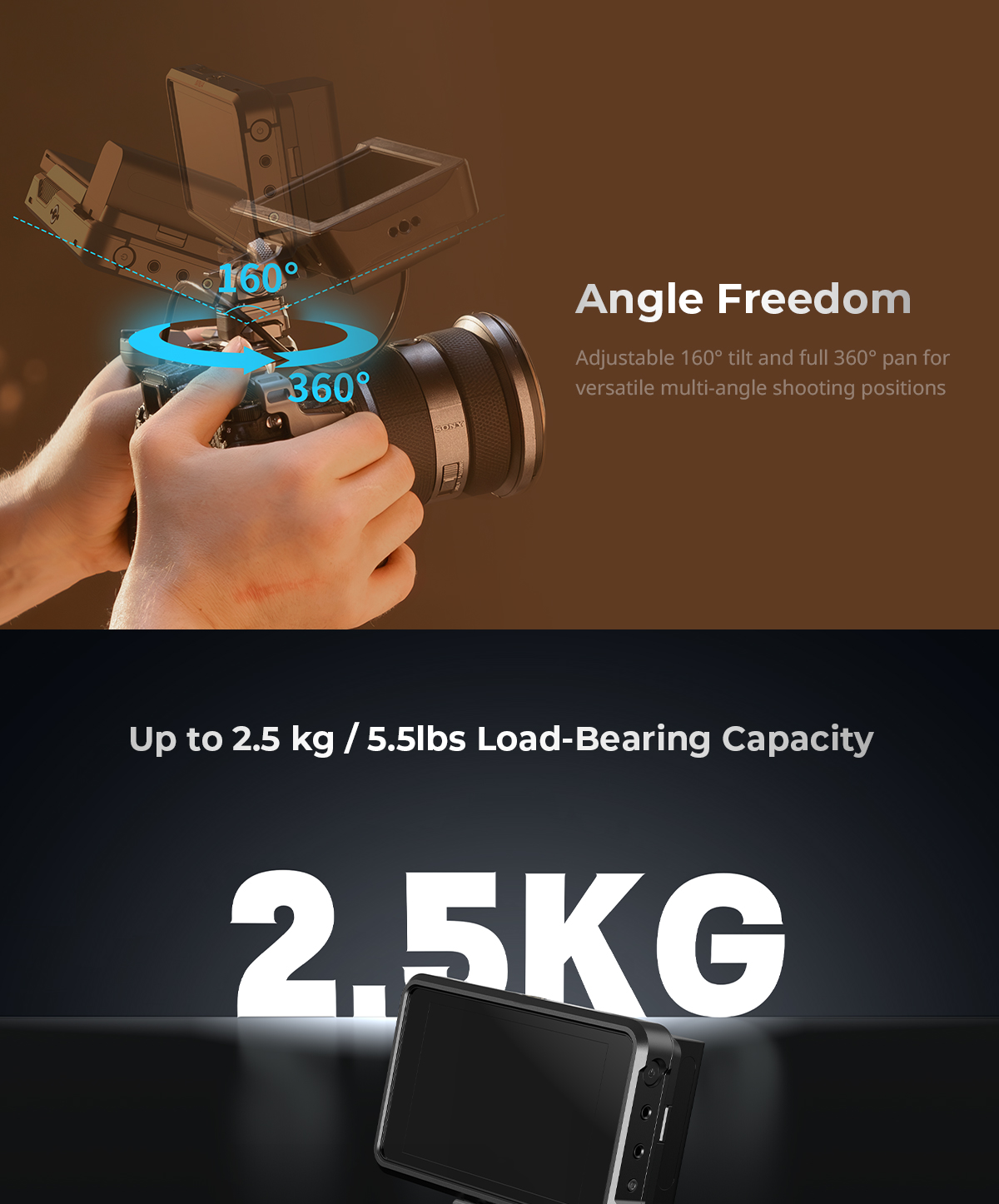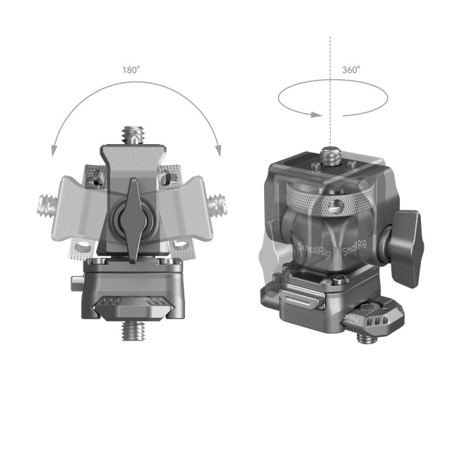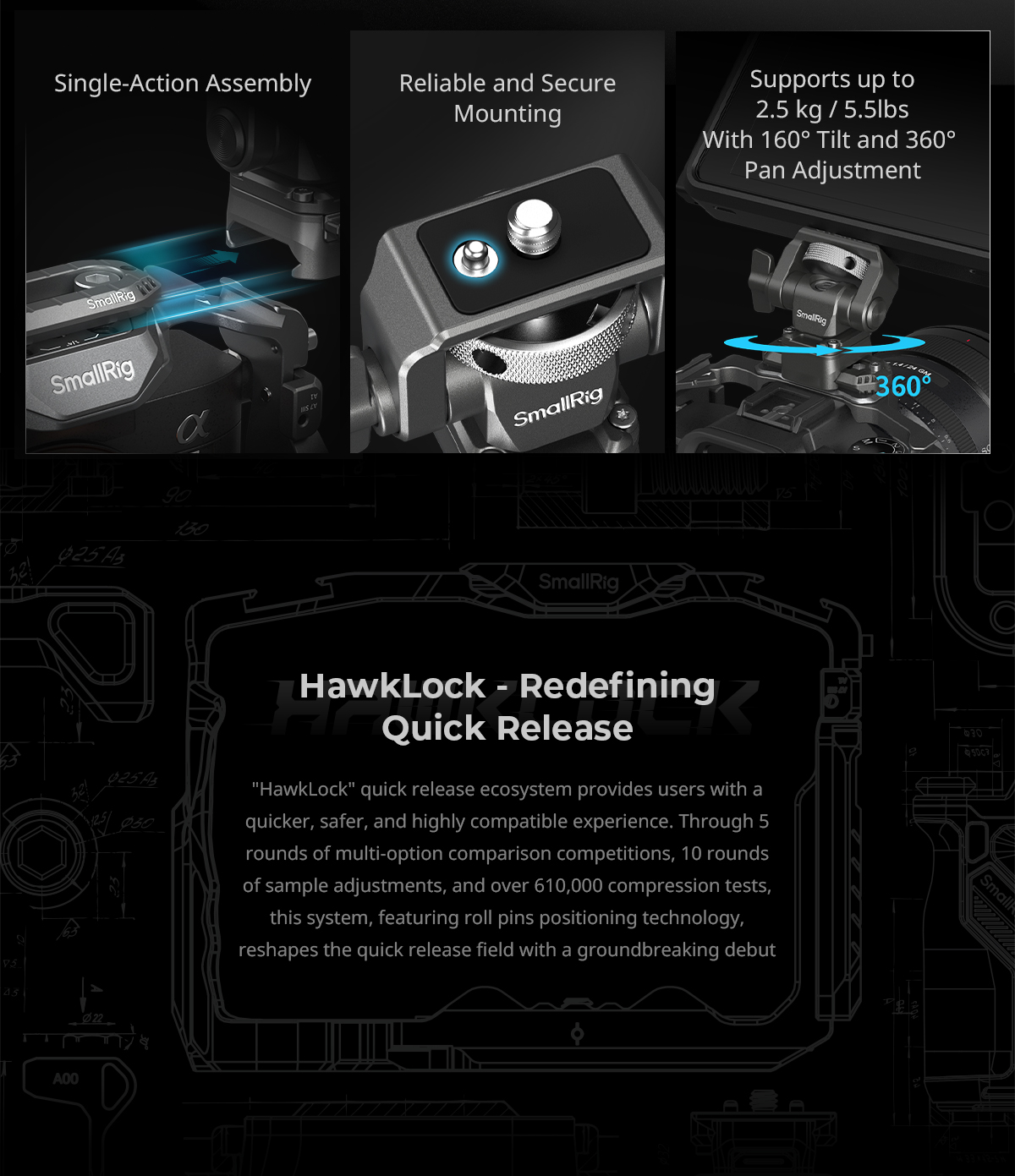 SmallRig HawkLock H21 Nosilec za monitor s hitrim sproščanjem in Natovo objemko 4487 je sestavljen iz nosilca za monitor s hitrim sproščanjem in Natovo objemko ter tirnice za hitro sproščanje. Pritisnite gumb, da se čepi razširijo, in potisnite tirnico NATO v utor. Spustite gumb, da se tirnica NATO varno zaskoči v nosilec monitorja, s čimer je konstrukcija stabilna, postopek pa časovno varčen. Z vijakom 1/4"-20 na vrhu lahko pritrdite monitor, mikrofon, luč ali, zaradi vgrajenega vzmetnega lokacijskega zatiča, monitor Ninja V / Ninja V+, da preprečite odklon. Element podpira nastavitev nagiba za 160°, tesnost osi nagiba pa lahko hitro prilagodite z gumbom, da se bolje prilagodi opremi različnih tež. Naprava lahko zdrži do 2,5 kg / 5,5 lb, oslabitev pa je po 10.000 naklonih pod 20 %, zato je vzdržljiva. nastavitev zasuka za 360° z nastavitvijo tesnosti vodoravne osi s priloženim šestilojemnim ključem.