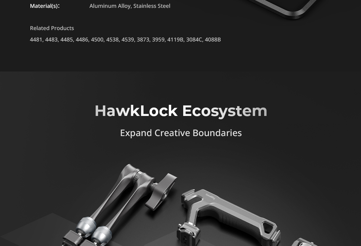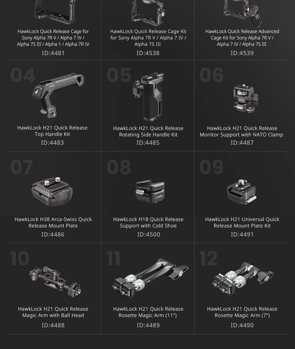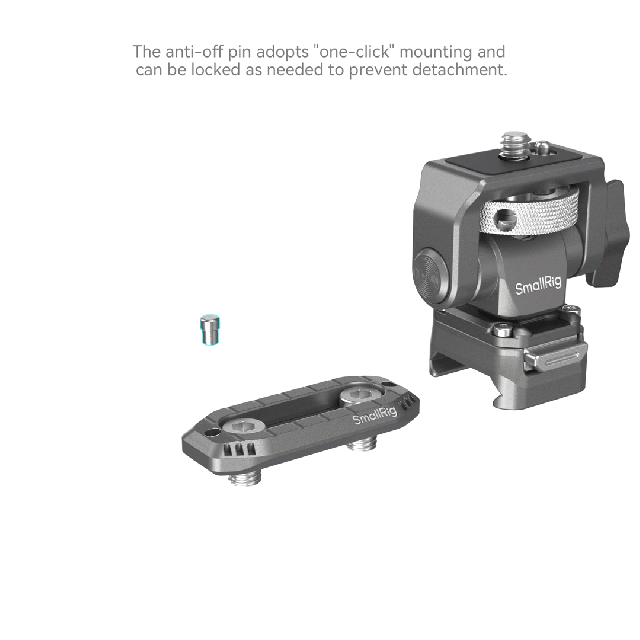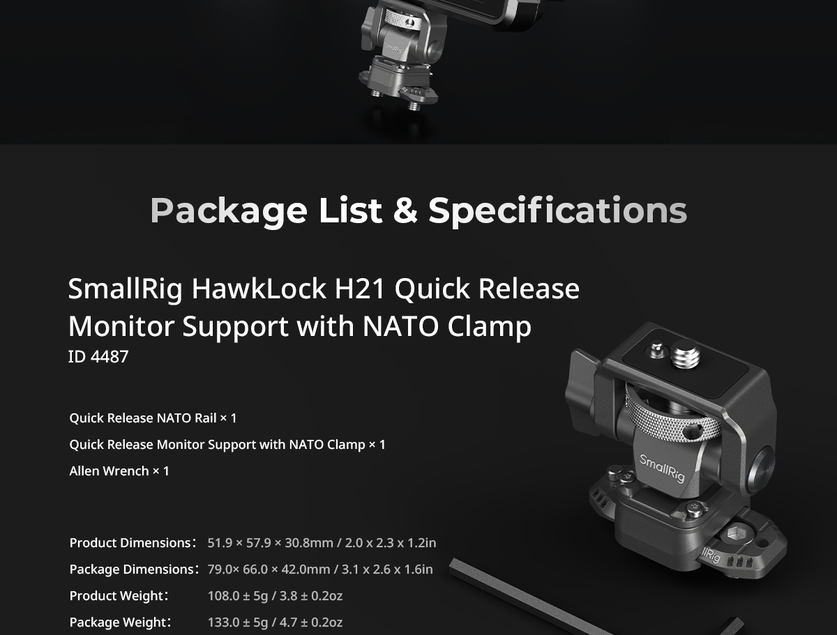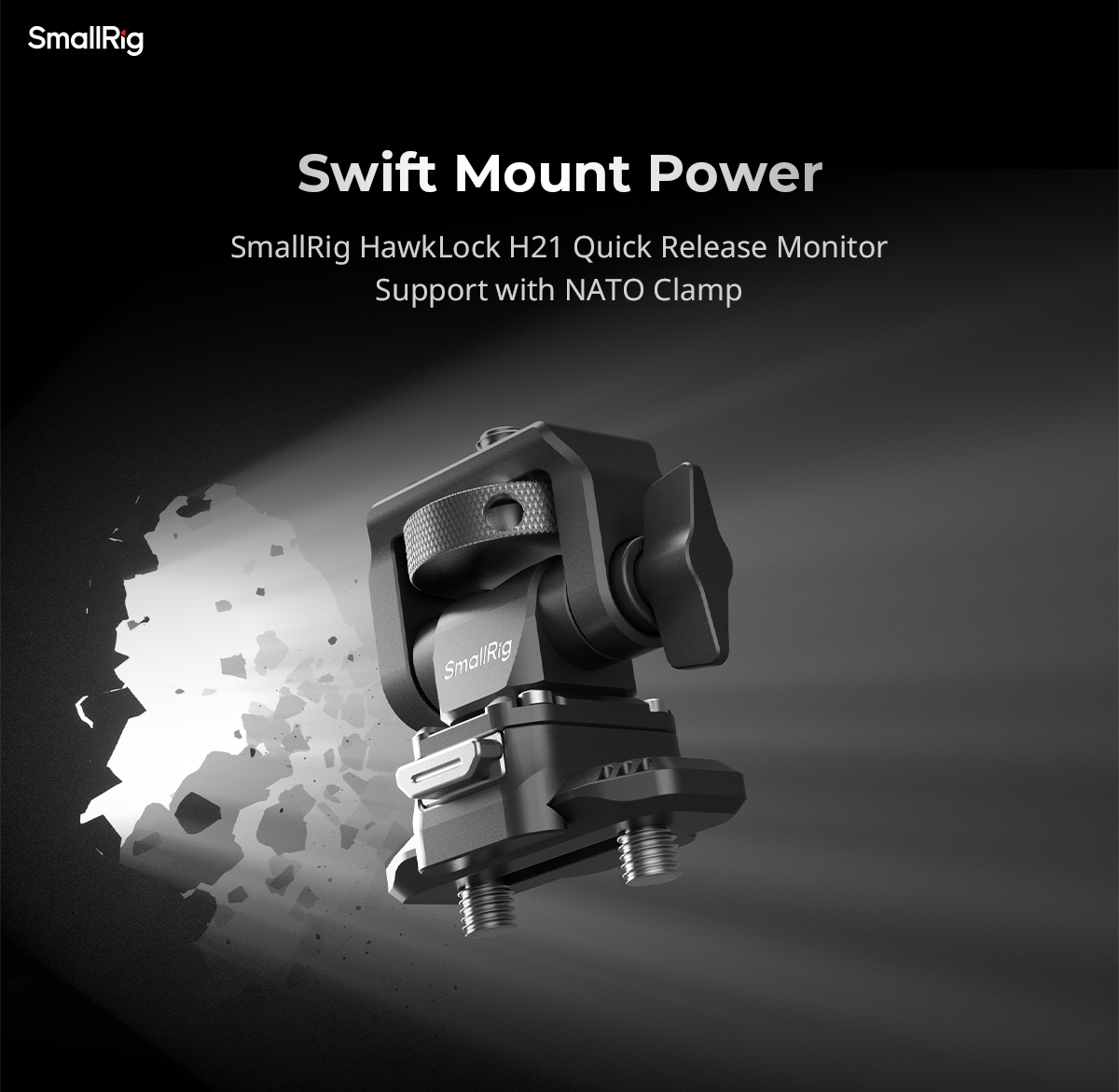 Nosilec za monitor SmallRig HawkLock H21 s hitrim sproščanjem in objemko NATO 4487 je sestavljen iz nosilca za monitor s hitrim sproščanjem in objemko NATO ter tirnice NATO s hitrim sproščanjem. Pritisnite gumb, da se čepi razširijo, in potisnite tirnico NATO v utor. Spustite gumb, da se tirnica NATO varno zaskoči v nosilec monitorja, s čimer je konstrukcija stabilna, postopek pa časovno varčen. Z vijakom 1/4"-20 na vrhu lahko pritrdite monitor, mikrofon, luč ali, zaradi vgrajenega vzmetnega lokacijskega zatiča, monitor Ninja V / Ninja V+, da preprečite odklon. Element podpira nastavitev nagiba za 160°, tesnost osi nagiba pa lahko hitro prilagodite z gumbom, da se bolje prilagodi opremi različnih tež. Naprava lahko zdrži do 2,5 kg / 5,5 lb, oslabitev pa je po 10.000 naklonih pod 20 %, zato je vzdržljiva. nastavitev zasuka za 360° z nastavitvijo tesnosti vodoravne osi s priloženim šestilojemnim ključem.