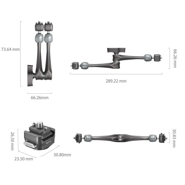 SmallRig HawkLock H21 Quick Release Rosette Magic Arm (11") 4489 je izdelan iz letalske aluminijaste zlitine in nerjavečega jekla. Ima ekskluzivno patentirano strukturo hitrega drsnika z notranjimi valjčki, ki omogočajo varno navpično zaklepanje. Zasnova z dvema hitrima vijakoma 1/4"-20 omogoča zunanjo pritrditev monitorjev, video luči, mikrofonov, pametnih…