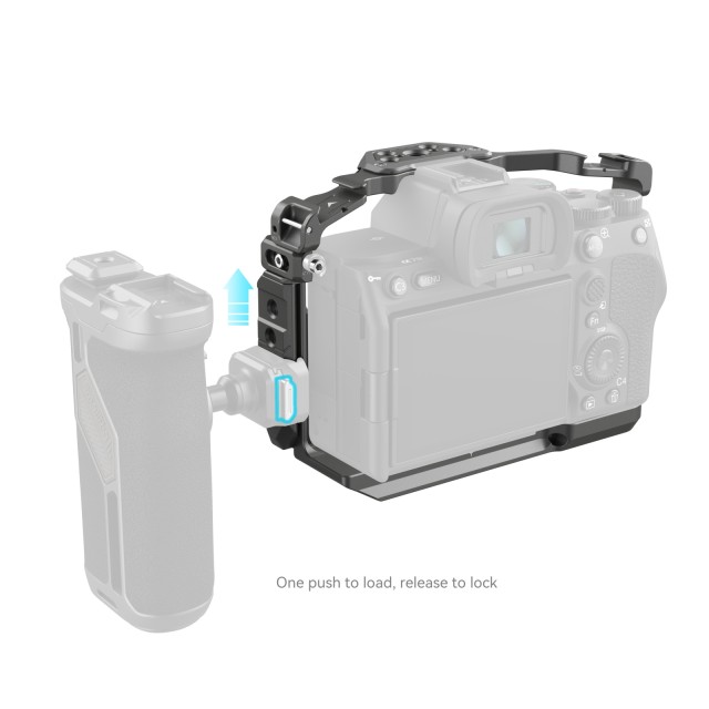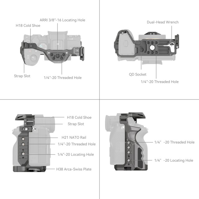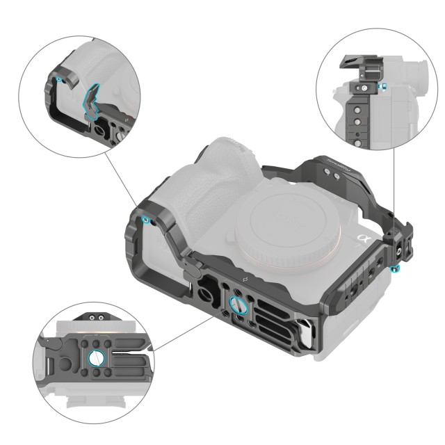 Kletka SmallRig HawkLock Quick Release Cage za Sony Alpha 7R V / Alpha 7 IV / Alpha 7S III / Alpha 1 / Alpha 7R IV 4481 je zasnovana tako, da omogoča pritrditev dodatne opreme in zaščito fotoaparata. Patentirana samorazvita struktura hitrega sproščanja (imenovana HawkLock) zajema hladne čevlje, tirnico NATO in arca swiss, ki se uporablja z ekološko opremo HawkLock za uresničitev trdnega in brez napačnega položaja, enega pritiska za nalaganje, sprostitve za zaklepanje in izboljšanje učinkovitosti razstavljanja. Fotoaparat zaklene z enim spodnjim lokacijskim zatičem, enim vijakom 1/4"-20 in enim vijakom M2,5 na levi strani.