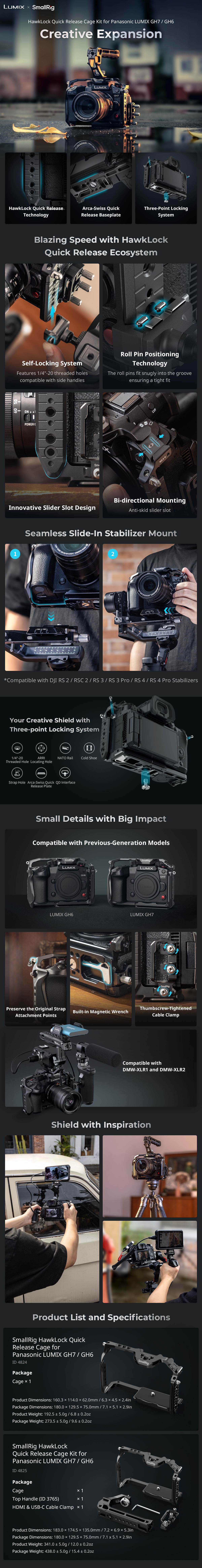 SmallRig HawkLock Quick Release Cage Kit za Panasonic LUMIX GH7 / GH6 4825 je zasnovan tako, da omogoča snemanje pod nizkim kotom in ščiti fotoaparat, hkrati pa ponuja širok nabor nastavkov za dodatno opremo. Vključuje kletko, objemko za kabel HDMI in USB-C ter zgornji ročaj. Patentirana samorazvita struktura hitrega sproščanja (imenovana HawkLock) zajema hladne čevlje, tirnico NATO in arca swiss, ki se uporablja z ekološkimi dodatki HawkLock za uresničitev trdnega in brez napačnega položaja, enega pritiska za nalaganje, sprostitve za zaklepanje in izboljšanje učinkovitosti demontaže.
