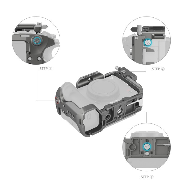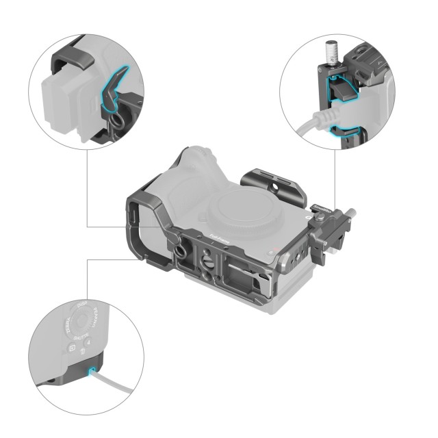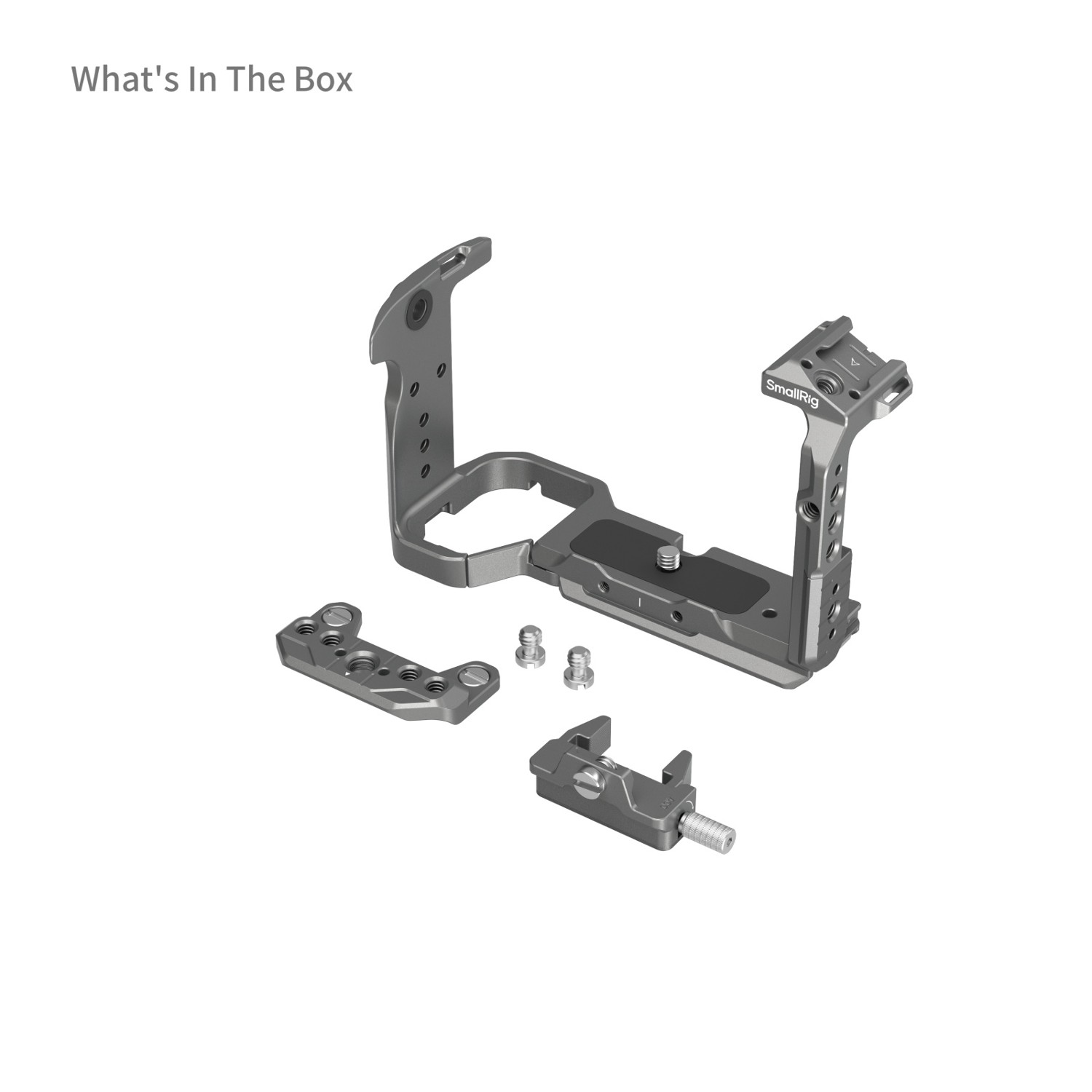 SmallRig HawkLock Quick Release Cage Kit za Sony FX3 / FX30 4770 je namenjen zaščiti fotoaparata in zagotavljanju točk za pritrditev dodatne opreme. Modularna kletka je sestavljena iz tirnice NATO in kletke v obliki črke U. Tirnica NATO je na vrhu pritrjena z dvema vijakoma 1/4"-20 in odstranjena, da je mogoče namestiti originalno zgornje držalo XLR; kletka v obliki črke U je pritrjena z vijaki 1/4"-20 na obeh straneh in na dnu, da se prepreči zasuk, z blazino proti praskam. Na vratih baterije se ročica tečaja prilega krivini fotoaparata za izboljšano izkušnjo prijema z malim prstom. Posebna objemka za kabel HDMI ščiti vmesnike in zagotavlja stabilen prenos signala.