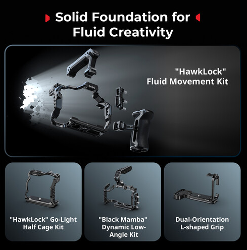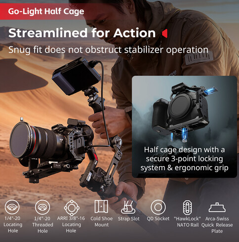 Ta kletka omogoča popoln dostop do upravljalnih elementov in vroče stopalke fotoaparata, kar vam omogoča, da mikrofone, luči ali drugo dodatno opremo namestite neposredno na kletko, ne da bi to vplivalo na delovanje fotoaparata. S številnimi navojnimi luknjami tipa ARRI 1/4"-20 in 3/8"-16 kletka podpira različne možnosti namestitve, vključno z dodatno opremo, kot so monitor ali zunanji snemalnik.