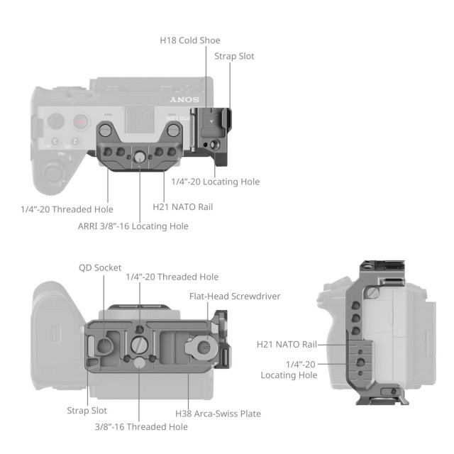 SmallRig HawkLock polkletka s hitrim sproščanjem za Sony FX3 / FX30 4772 je zasnovana za zaščito fotoaparata in zagotavljanje točk za pritrditev dodatne opreme. Modularna kletka je sestavljena iz zgornje plošče (tirnica NATO) in kletke v obliki črke L. Tirnica NATO je na vrhu pritrjena z dvema vijakoma 1/4"-20 in odstranjena, da je mogoče namestiti originalno zgornje držalo XLR; kletka v obliki črke L je pritrjena z vijakom 1/4"-20 na levi strani in na dnu, da se prepreči zasuk, z blazino proti praskam. Patentirana struktura hitrega sproščanja, ki jo je razvil sam (imenovana HawkLock), pokriva hladno peto, tirnico NATO in ploščico Arca-Swiss.
