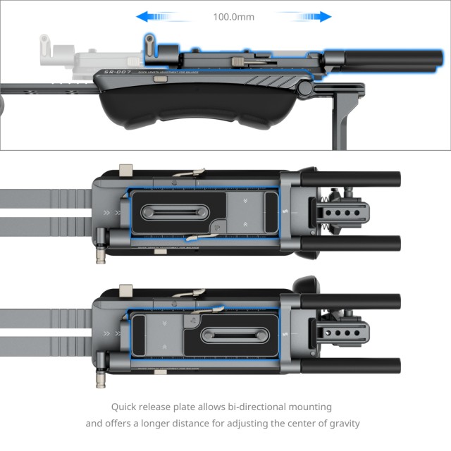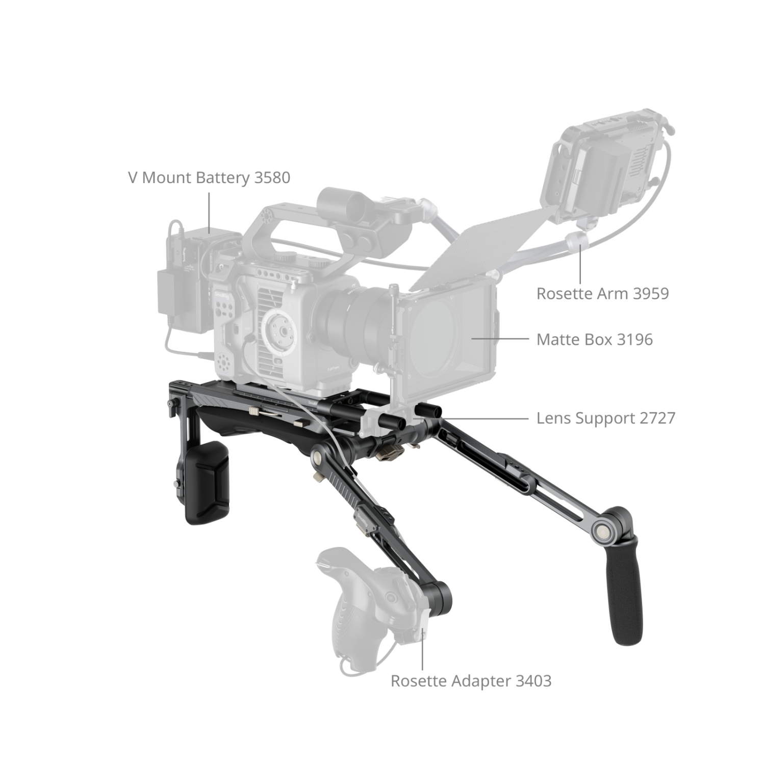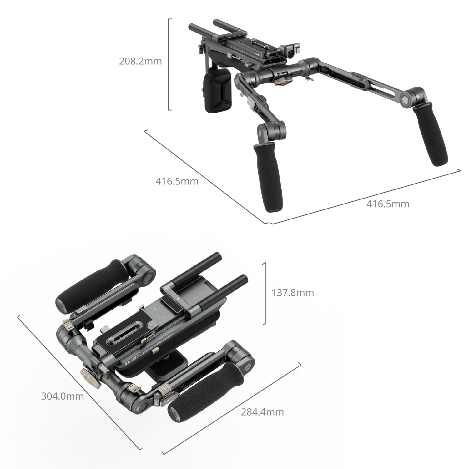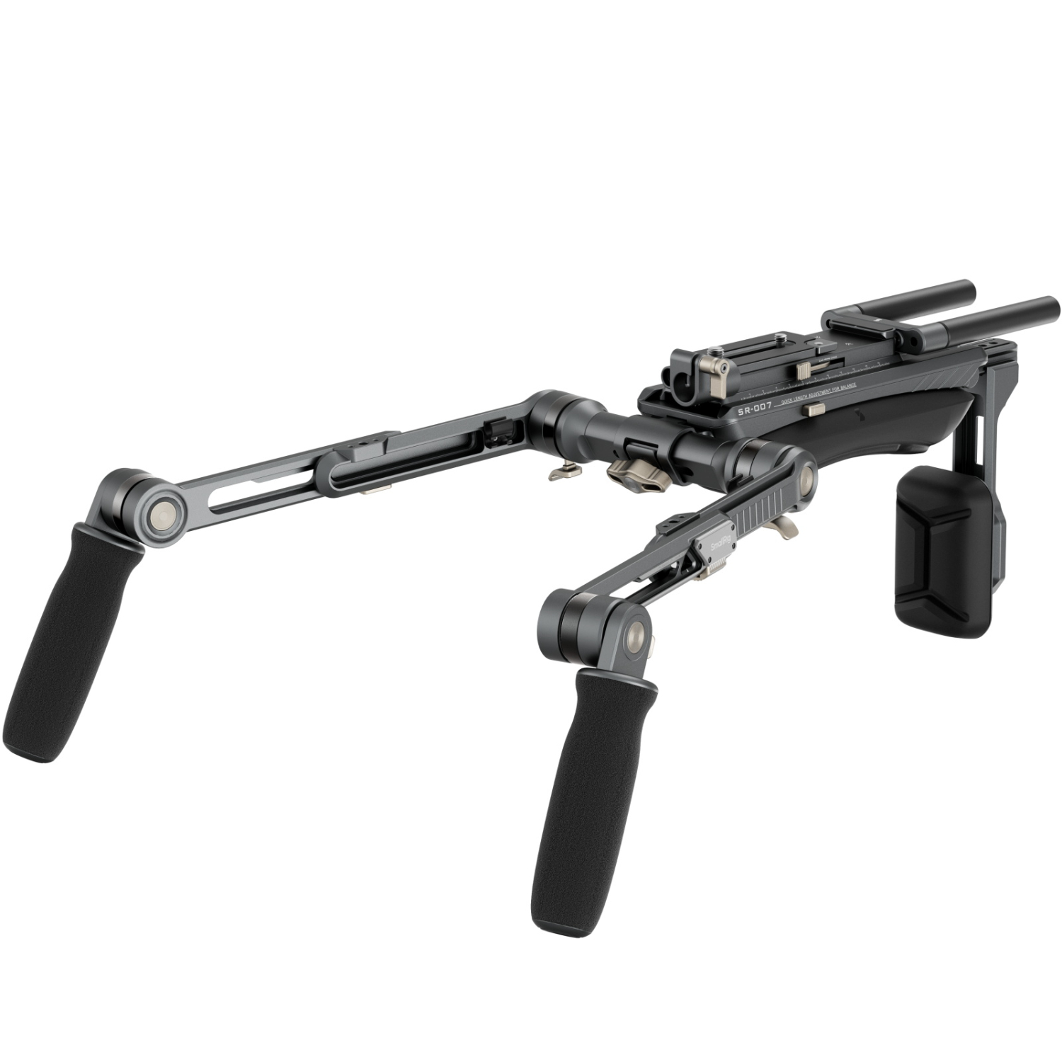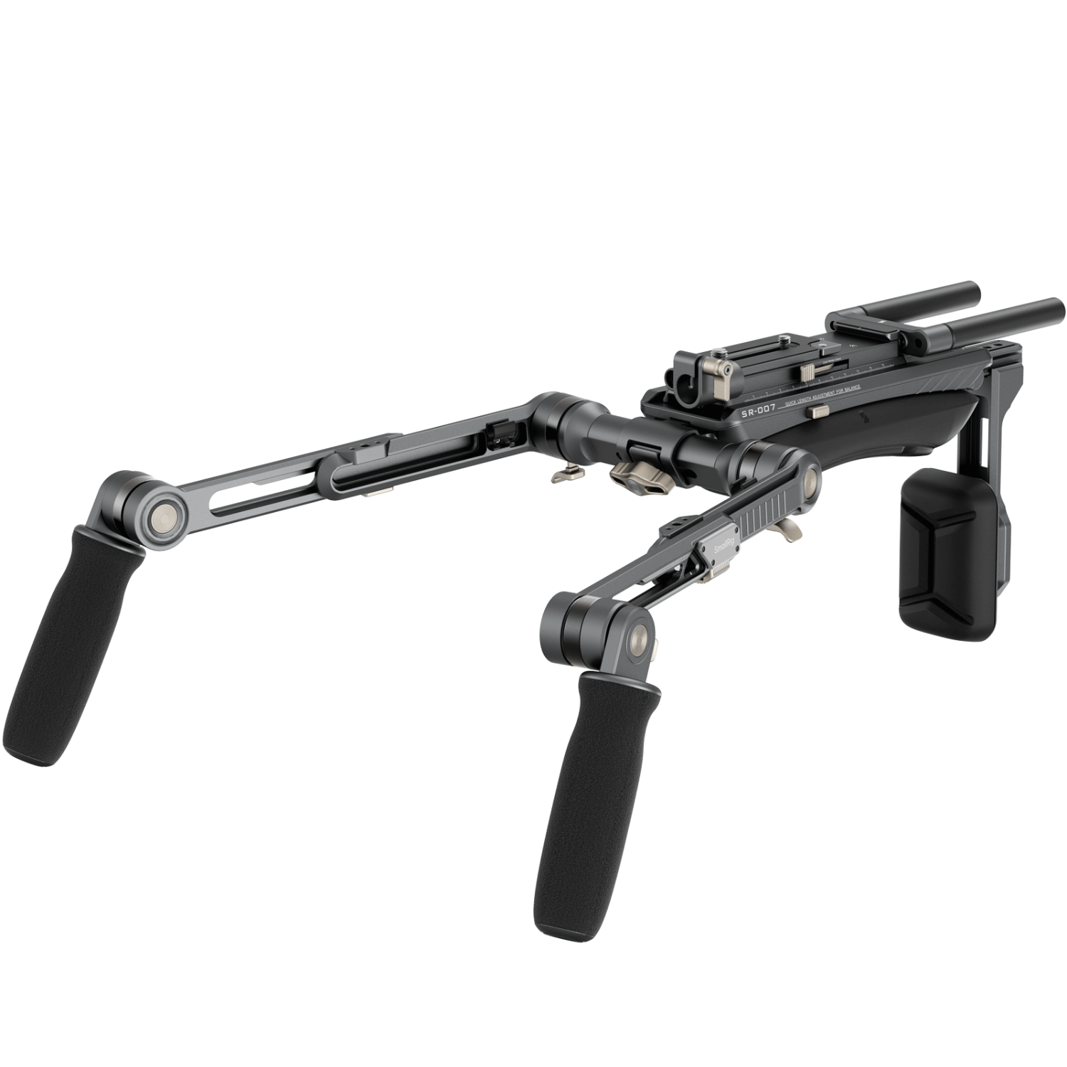 Komplet ramenske opreme ima ergonomske ročaje z drobnimi teksturami, ki zagotavljajo udoben oprijem in omogočajo 360-stopinjsko vrtenje. Povezovalno gred podaljškov je mogoče vodoravno nastaviti za optimalen nadzor, medtem ko poenostavljene ramenske in hrbtne blazinice zagotavljajo izjemno podporo. Hrbtna blazinica se prilagodi do 90° za tesno prileganje pri vsakem kotu snemanja, ploščica za hitro sprostitev pa omogoča enostavno prilagajanje od spredaj nazaj za hitro uravnoteženje.