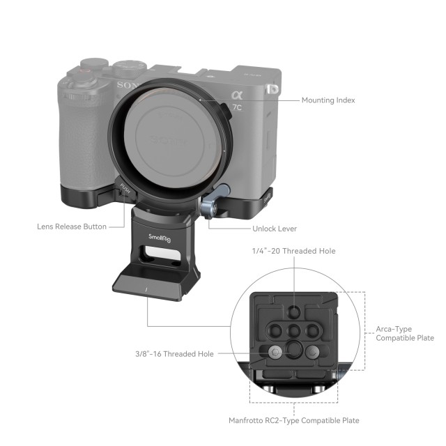 Sada destiček SmallRig Horizontal-to-Vertical Mount Plate Kit pro Sony Alpha 7C II / Alpha 7CR 4570 je určena k rychlému přepínání mezi horizontálním a vertikálním režimem bez nutnosti nastavování optické osy objektivu. Zajišťuje spodní část fotoaparátu pomocí šroubu 1/4"-20 a kolíku proti zkroucení a zachovává plný přístup k výklopnému displeji LCD a portům a je vybavena vestavěnými podložkami, které zabraňují poškrábání a zkroucení. Je kompatibilní se stativem Arca-type / Manfrotto RC2, montážní desku lze odjištěním knoflíku otočit o 90 stupňů a přepínat tak mezi horizontálním a vertikálním snímáním. Její spodní otvory se závity 1/4"-20 a 3/8"-16 podporují také rukojeť 2093C atd. pro zvýšení stability v režimu z ruky. Základní desku lze použít samostatně podle různých potřeb, přičemž rameno závěsu u bateriových dvířek dokonale přiléhá k tělu fotoaparátu pro lepší úchop. Je také vybavena otvorem pro řemínek, otvorem se závitem 1/4"-20 pro zápěstní řemínek, rychloupínací destičkou atd. a magnetickým plochým šroubovákem pro snadnou instalaci a uvolnění.