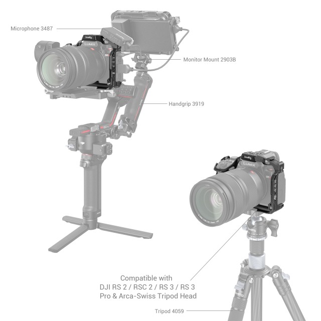 Kletka SmallRig "Black Mamba" za Panasonic LUMIX S5 II / S5 IIX 4023 je zasnovana za zaščito fotoaparata in pritrditev dodatne opreme. Fotoaparat zaklene z enim spodnjim vijakom 1/4"-20 in dvema stranskima zaklepnima nastavkoma, z gumijastimi blazinicami, ki preprečujejo praske, kot celota pa ima obliko v slogu "Black Mamba", ki omogoča popoln dostop do vseh zgornjih upravljalnih elementov. Točke za pritrditev dodatne opreme vključujejo luknje 1/4"-20 za stranski ročaj 2093B; sprednja luknja 1/4"-20 za namestitev ustreza objemki palice 3276 za sistem sledenja ostrenju; luknja za namestitev 3/8"-16 ARRI pa ustreza zgornjemu ročaju 3786 ali držalu za monitor 2903B. Opremljen je tudi z levo tirnico NATO za stranski ročaj 3847; z nastavki za hladno čeveljnico za pritrditev mikrofona in video luči LED ter s spodnjo vtičnico QD za namestitev ramenskega traku QD. Na dnu je ploščica za hitri sprožilec Arca-Swiss, primerna za gimbale DJI RS 2 / RSC 2 / RS 3 / RS 3 Pro in stative Arca-Swiss, ter navojna odprtina za ploščico za hitri sprožilec DJI RS 2 / RSC 2 (riser pad) in ploščico za hitri sprožilec Arca-Type 3154. Element ima na obeh straneh in na dnu tudi luknje za trakove, ki so združljive z ročnim pasom 3848, ramenskim pasom PSC2428 itd. Poleg tega je priložen magnetni ključ za enostavno odstranjevanje in nameščanje.