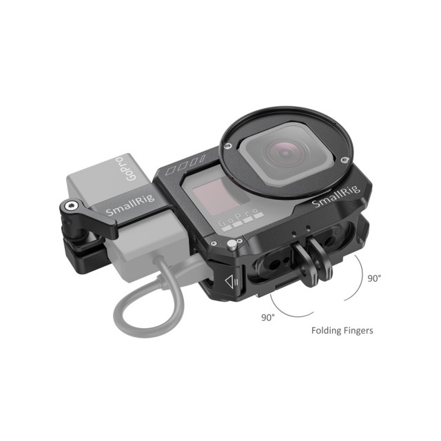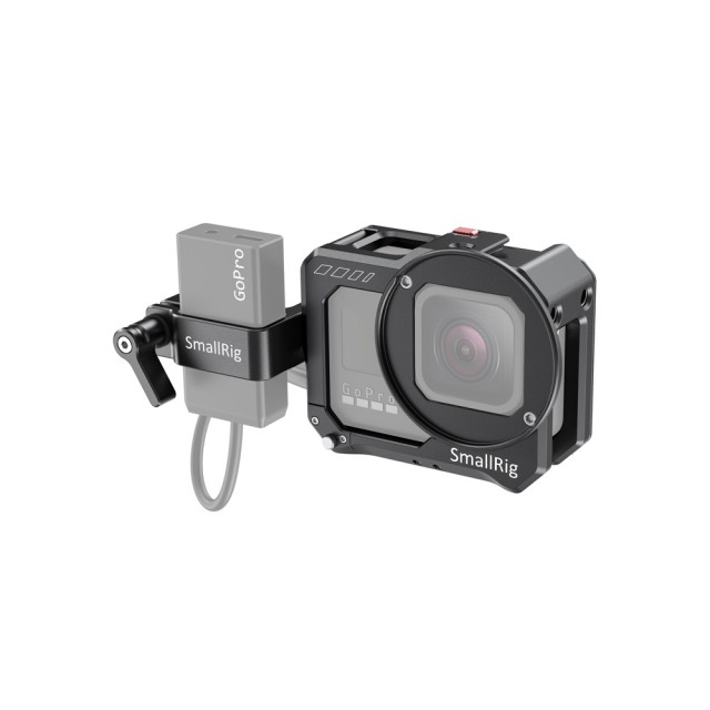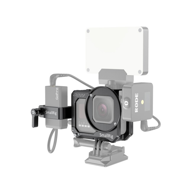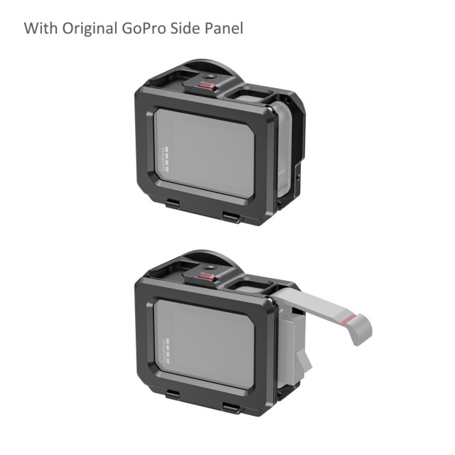 Kletka je opremljena z dvema hladnima vtičnicama in več luknjami 1/4"-20 za pritrditev dodatne opreme, kot so mikrofon, majhna luč LED, držalo SmallRig Cold Shoe Mount 1593 ali Cold Shoe Mount 1960. GoPro Microphone Adapter Mount se pritrdi na desno stran kletke z dvema priloženima vijakoma 1/4"-20. Preklopni prsti na dnu omogočajo namestitev kamere na različne GoPro nosilce in površine; medtem ko držalo 1/4"-20 na sredini omogoča namestitev kamere na stativ 1/4"-20. Stranska plošča je hitro snemljiva za menjavo baterij, kamero pa lahko polnite prek vrat USB-C brez odpiranja plošče. Na sprednji strani kletke je obroč za filtre, ki sprejme filtre z 52 mm navojem.
