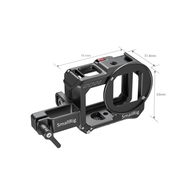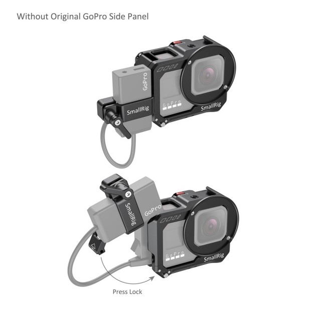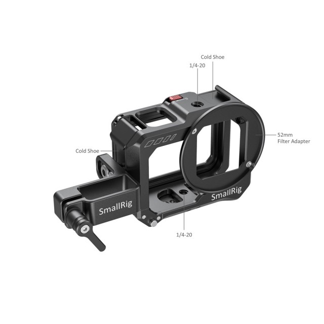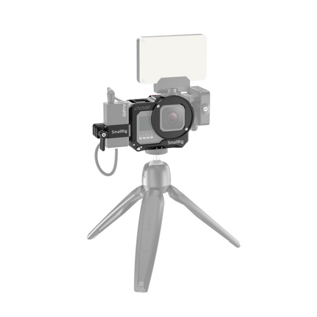 Kletka SmallRig Vlogging Cage and Mic Adapter Holder for GoPro HERO8 Black CVG2678 je lahka aluminijasta kletka, ki ščiti kamero, hkrati pa zagotavlja veliko oprijemal za dodatno opremo, ne da bi ovirala dostop do gumbov, vrat in baterije kamere. Kamero potisnite v kletko (najprej odstranite stranski pokrov baterije kamere) in preprosto stisnite pokrov.