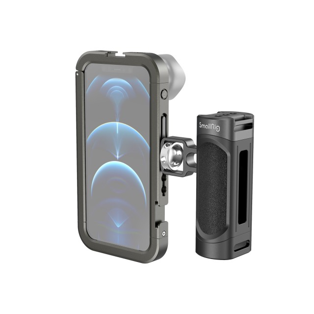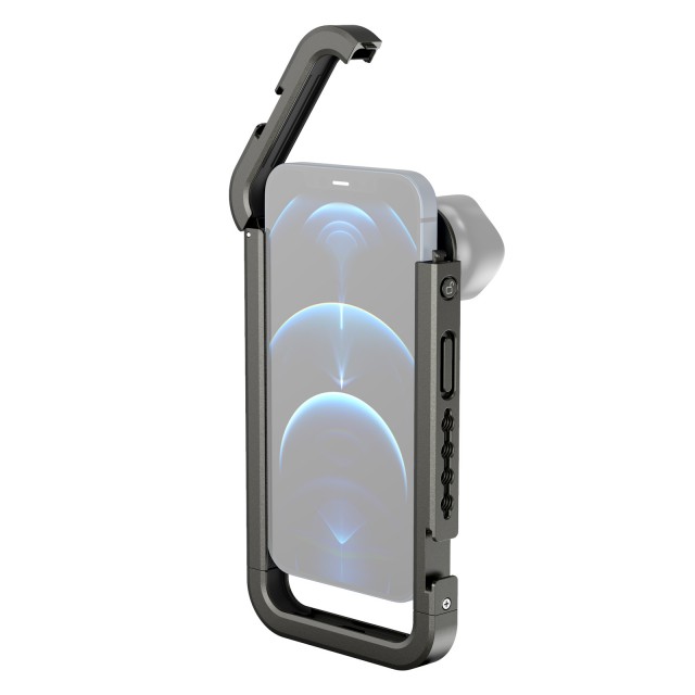 SmallRig Handheld Video Rig za iPhone 12 Pro 3175 je popolna platforma za mobilne telefone in snemanje vlogov, mobilnih filmov, oglasov itd. Oprema ima kletko, posebej zasnovano za iPhone 12 Pro, in stranski ročaj za stabilnejše snemanje s telefonom iz roke. Opremljena je z dvema hladnima vtičnicama in več luknjami z navojem 1/4 za priključitev dodatne opreme, kot so mikrofon, luč LED, stativ itd. Podpira tako vodoravno kot navpično fotografiranje. Nastavek za objektiv na zadnji strani omogoča, da na telefon preprosto pritrdite zunanji objektiv.
