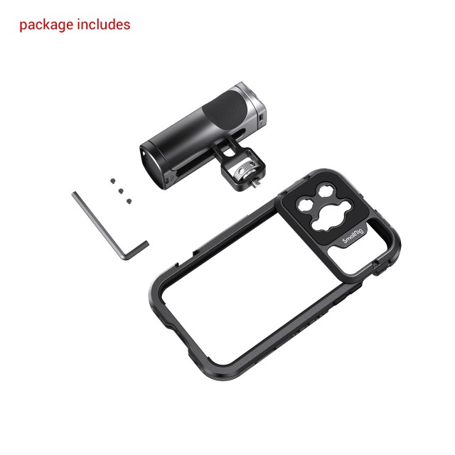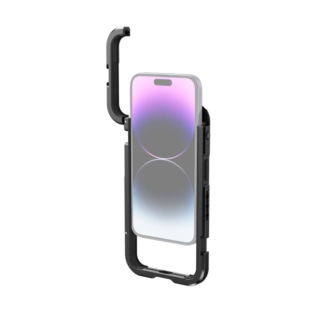SmallRig Mobile Video Cage Kit (en ročni) za iPhone 14 Pro Max 4099 je popolna mobilna videokamera za snemanje vlogov, mobilnih filmov, oglasov itd. Komplet je opremljen s kletko, posebej zasnovano za iPhone 14 Pro Max, in stranskim ročajem za brezžično upravljanje za stabilnejše in udobnejše snemanje s telefonom. Kletka ima luknje z nasprotnim navojem 1/4"-20 in držala za hladno podstavek za podporo dodatkom, kot so stativ, mikrofon, LED-lučka itd. Z zamenjavo zadnje plošče podpira objektive z bajonetom M ali 17 mm navojem. Vdolbinasta zasnova omogoča dostop do gumbov, vrat, radarja in izjemno širokega objektiva za iPhone. Nova zasnova povečuje golo hrbtno površino in je popolnoma združljiva z uradnimi Applovimi napravami za brezžično polnjenje. Kovinska polna kletka z vgrajenimi blazinicami preprečuje praske in zmanjšuje vibracije. Kletka omogoča vodoravno in navpično skeniranje.