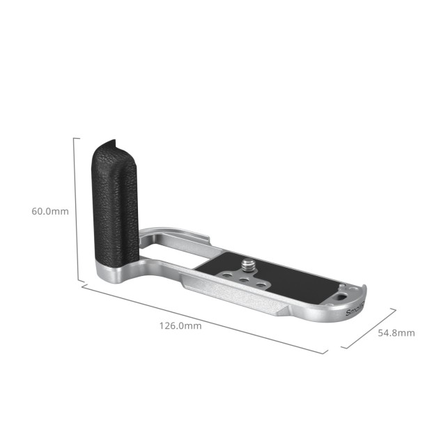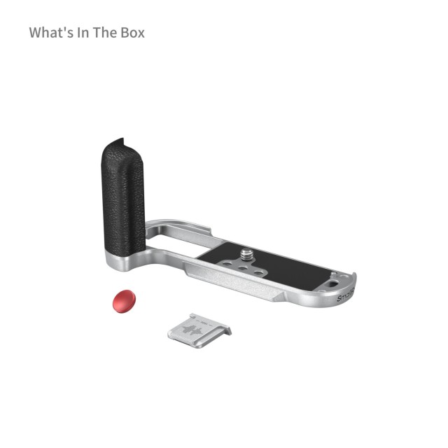 Ploščica SmallRig z držalom v obliki črke L za FUJIFILM X-T50 (silikon/srebro) 4713C je zasnovana tako, da izboljša oprijem fotoaparata. Ročaj v obliki črke L se na fotoaparat pritrdi z vijakom 1/4"-20 na dnu, vgrajene silikonske blazinice pa preprečujejo nastanek prask. Tekstura in barva ročaja se popolnoma ujemata s fotoaparatom FUJIFILM X100VI / X100V. Vgrajena osnovna plošča za hitro sprostitev Arca-Swiss omogoča enostavno in hitro montažo in demontažo stativa tipa Arca. Štiri luknje z navojem 1/4"-20 na dnu za pritrditev plošč in stativov tipa Manfrotto. Reža za zapestni trak (ID: 3848). Vgrajen ploščati ključ na dnu za enostavno sestavljanje in razstavljanje dodatne opreme. Držalo je opremljeno z ekskluzivnim pokrovom vroče čevlje, na katerem sta odtisnjena zvočni val "FUJIFILM" in leto ustanovitve kot naš poklon družbi FUJIFILM. Opremljen je tudi z gumbom za sprostitev zaklopa, ki zagotavlja mehak in udoben dotik s prsti.