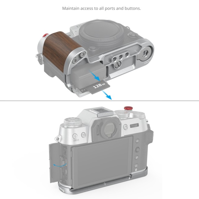 Plošča SmallRig z držalom v obliki črke L za fotoaparat FUJIFILM X-T50 (srebrna) 4735B je zasnovana tako, da izboljša oprijem fotoaparata. Držalo v obliki črke L se na fotoaparat pritrdi z vijakom 1/4"-20 na dnu, vgrajene silikonske blazinice pa preprečujejo nastanek prask. Držalo je izdelano iz naravnega masivnega lesa, elegantno, z bogatim, naravnim občutkom, in ergonomsko oblikovano za izboljšanje občutka prijema. Vgrajena osnovna plošča s hitrim sproščanjem Arca-Swiss omogoča enostavno in hitro montažo in demontažo stativa tipa Arca.