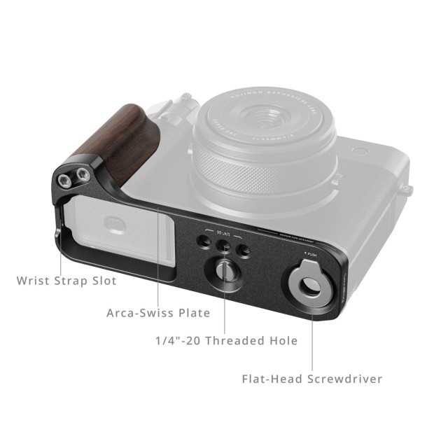 SmallRig L-shape Mount Plate with Wooden Handle for FUJIFILM GFX100RF (Black) 5266 je strokovno zasnovan tako, da izboljša estetiko in nadzor vašega fotoaparata. Varno se pritrdi z vijakom 1/4"-20 in ima vgrajene silikonske blazinice, ki preprečujejo nastanek prask.