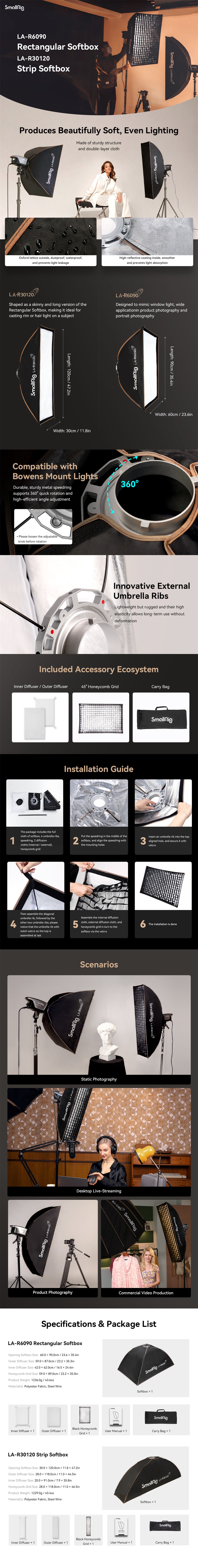 LA-R6090 je pravokotni softbox z dimenzijami 60 x 90 cm. Ima univerzalni nastavek Bowens, zato je združljiv z napravami SmallRig RC120D/RC120B, RC220D/RC220B, RC350D/RC350B, RC450D/RC450B in drugimi lučmi z nastavkom Bowens na trgu. Standardno ima notranje/izvene difuzorje in 45° satovje za večjo usmerjenost v različnih prizorih.