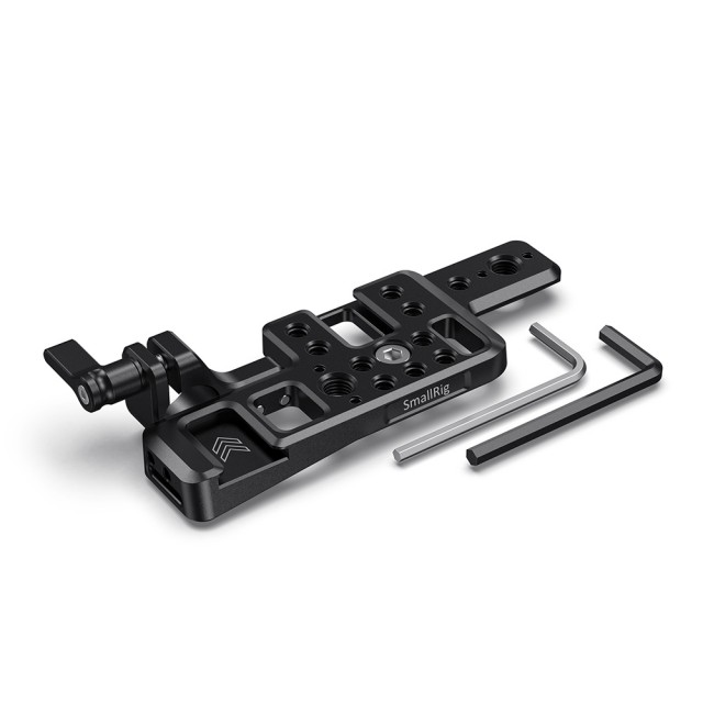 Lahka zgornja plošča SmallRig za BMPCC 4K in 6K APT2510 se varno pritrdi na fotoaparat z vijakom 1/4"-20 in zdrsne v odprtino za trak proti vrtenju na levi strani. Ta možnost je primerna za tiste, ki imajo raje lažjo ročno nastavitev ali boljše ravnotežje kardana. Plošča ima različne možnosti pritrditve, vključno z luknjami 1/4"-20 in 3/8"-16, luknjami za pozicioniranje ARRI, dvema hladnima podstavkoma in vgrajenim vodilom NATO, ki omogoča enostavno pritrditev lahke dodatne opreme, kot so majhen mikrofon, 5-palčni monitor ali pogon SSD. Priložena 15-milimetrska objemka za palico je odstranljiva in jo lahko namestite na nekaj izbranih mest, tako da lahko za dodajanje dodatne dodatne opreme uporabite ločeno dobavljivo 15-milimetrsko palico.