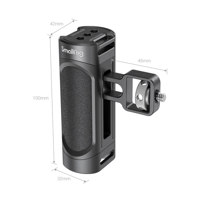 Lahki stranski ročaj SmallRig za kletko za pametne telefone 2772 je zasnovan tako, da se prilega kletki za telefon SmallRig in izboljša udobje prijema za trajnejši in stabilnejši oprijem telefona. Združljiv je s kletkami za mobilni telefon SmallRig Pro, kot so 2775, 2776 itd., in univerzalnimi kletkami SmallRig, kot so CPU2391B, 2791 itd. Z vgrajenim ključem lahko nastavite višino ročaja in zategnete zaporni vijak. Na vrhu ima tri standardne luknje z navojem 1/4-20 za pritrditev dodatne opreme. Ročaj je združljiv s pasom SmallRig PAC2456 za varnejše in stabilnejše snemanje iz roke. Tehta le 120 g, na površini pa ima nedrseče gumijaste blazinice, ki zagotavljajo udoben oprijem pri dolgotrajni uporabi.