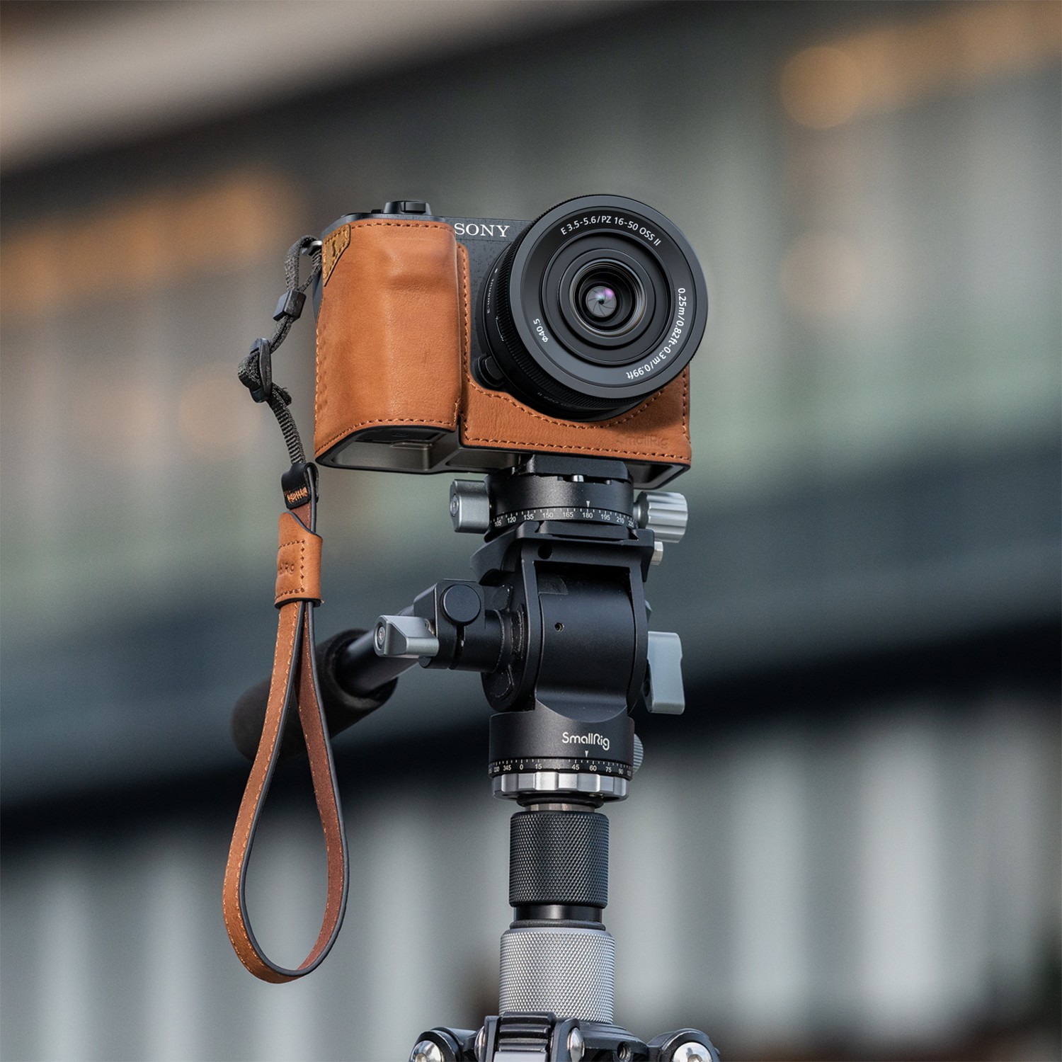 SmallRig Leather Case Kit for Sony ZV-E10 II (Brown) 4889 je zasnovan tako, da ščiti vaš fotoaparat in hkrati ohranja njegovo klasično podobo. Komplet vključuje usnjeno ohišje in zapestni trak, ki sta izdelana iz trpežnega in zračnega vrhunskega usnja. Vgrajen ročaj iz pene zagotavlja ergonomski oprijem z dodatno varnostjo, medtem ko plišasta notranja obloga ščiti fotoaparat pred praskami. Vijak s palcem 1/4"-20 na dnu omogoča namestitev fotoaparata brez uporabe orodja. Zasnova etuija zagotavlja neoviran dostop do vmesnikov in gumbov fotoaparata, kot so prostor za baterijo, način ostrenja in reža za kartice. Z vgrajenim notranjim okvirjem iz aluminija letalske in vesoljske kakovosti ohišje ne zagotavlja le tesnega prileganja, temveč fotoaparat ščiti tudi pred udarci in trki. Na dnu je v pritrdilni vijak vgrajena luknja z navojem 1/4"-20, ki omogoča neposredno namestitev na stativ, ne da bi bilo treba odstraniti ohišje. Poleg tega je v kompletu priložen zapestni trak iz pravega usnja za udobno in zanesljivo prenašanje fotoaparata.