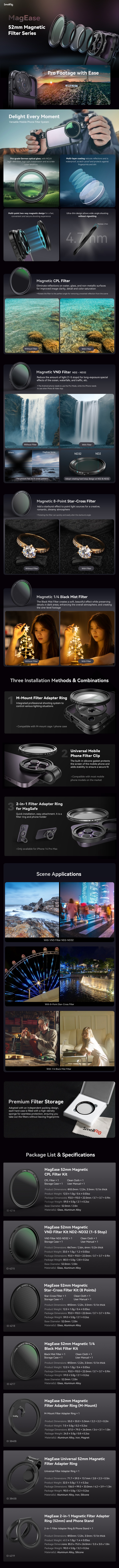 Magnetno in hitro pritrdite Očala HD iz Nemčije Vodoodporni premazi AR, odporni na madeže, plesen in praske Velik premer in izjemno tanek filter; brez vinjetiranja Na sliki ni križnega vzorca Magnetno pritrdi 52-milimetrski magnetni obroč za adapter za filter SmallRig, varen in stabilen Trdi…