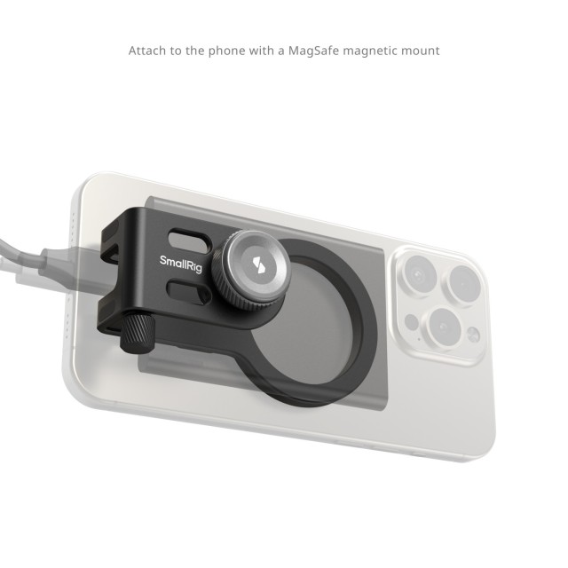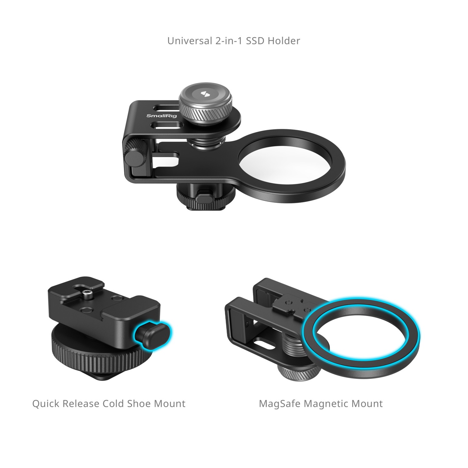 SmallRig MagSafe / Cold Shoe Universal 2-in-1 SSD Holder 4779 je zasnovan za priključitev zunanjih trdih diskov USB-C med fotografiranjem s pametnim telefonom. Združljiv je z 8,0-16,0 mm debelimi SSD-ji, predvsem z modeli Samsung T7, Samsung T7 Shield in Samsung T9. Prijemalo ima drsni nastavek za hladno podstavek, ki ga lahko hitro namestite na dno prijemala, kar omogoča pritrditev na različne naprave. Za magnetno pritrditev MagSafe na želena mesta, kot so prenosni računalniki ali telefoni iPhone s sistemom MagSafe, odstranite nastavek hladne čevlje. Oba načina namestitve sta preprosta in hitra, kar omogoča nemoteno prehajanje med različnimi načini uporabe. Poleg tega je objemka opremljena s silikonsko podlogo, ki preprečuje praske na SSD-ju. Kabelska sponka na dnu pritrdi kabel USB-C z vijakom s palcem za priročen in stabilen prenos podatkov. Poleg tega vključuje kovinsko obročasto nalepko za vsestransko uporabo v različnih okoljih.