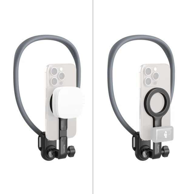 Nosilec za vrat ima univerzalni dvokolesni nastavek za akcijske kamere in magnetni nastavek za telefon za takojšnjo pritrditev telefona iPhone. Držalo za telefon je opremljeno s 17 močnimi magneti N52 za varen oprijem, skupaj z dodatnim magnetnim adapterskim obročem za naprave Android in naprave, ki niso MagSafe. Kadar se ne uporablja za pametne telefone, lahko na vratni nosilec neposredno namestite akcijske kamere.