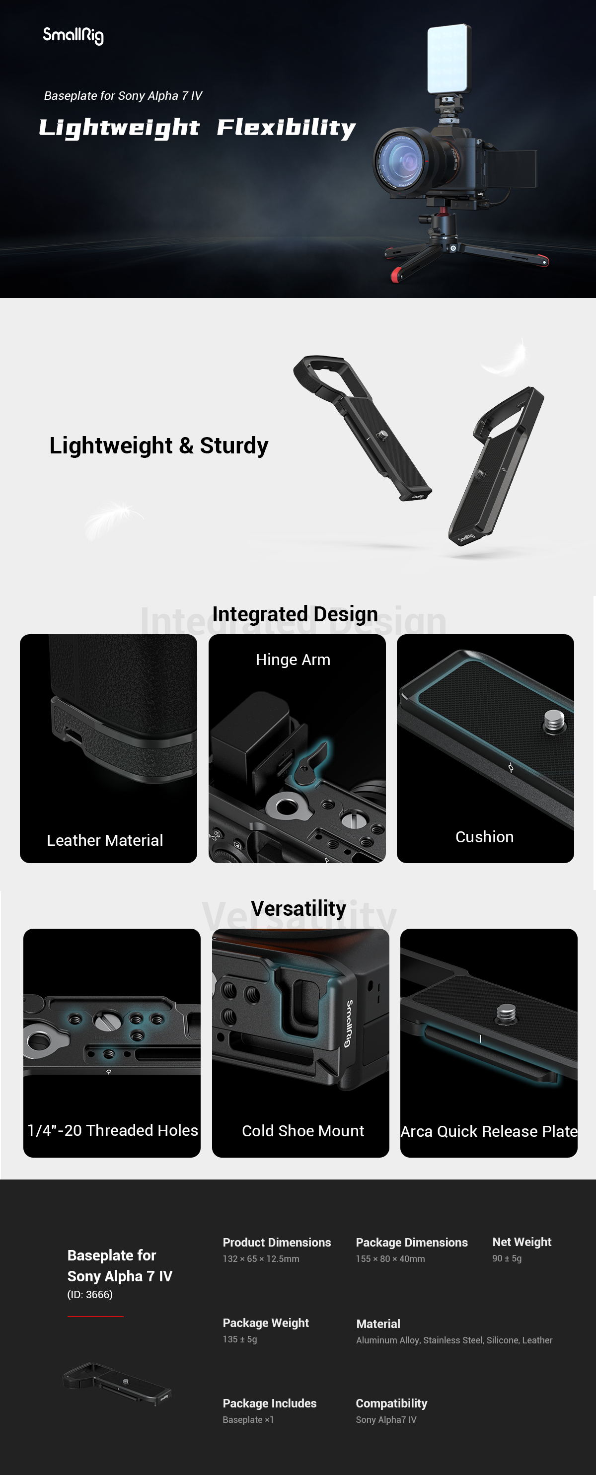 SmallRig osnovna plošča za Sony Alpha 7 V / 7R V / Alpha 7 IV 3666 je namenjena izboljšanju oprijema in omogoča snemanje s stativom ali iz roke, hkrati pa ščiti spodnji del kamere. Pritrdi se na spodnjo stran kamere z vijakom 1/4"-20 in pozicionirnim zatičem ter ima vgrajeno silikonsko blazinico, ki preprečuje praske in zvijanje. Pokrovček baterije ima ključ, ki se prilagaja krivini kamere in pušča prostor za mali prst, kar omogoča udoben oprijem; vgrajen je v izbrano pravo usnje v osnovni plošči in se integrira v ohišje kamere. 1/4"-20 navojne luknje in hladni nosilci na spodnji strani podpirajo mini stative in mikrofone. Poleg tega podstavek, združljiv z Arca, omogoča hitro preklapljanje med stativom, stabilizatorjem (DJI RS 2 / RSC 2 / RS 3 / RS 3 Pro) in ročnim snemanjem. Vgrajen magnetni ključ omogoča enostavno odstranjevanje in namestitev.
