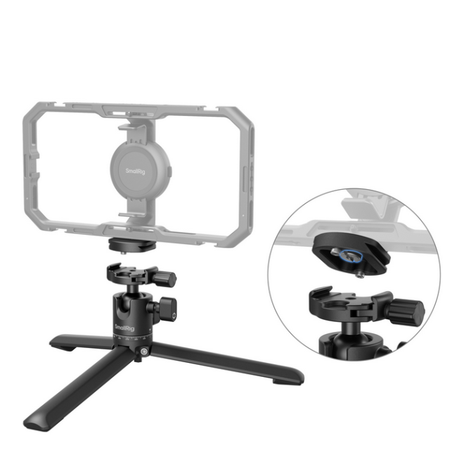 Kovinski namizni stativ SmallRig s ploščo za hitro sproščanje Arca-Swiss in panoramsko kroglično glavo 4630 ponuja vsestransko združljivost in stabilnost za različne naprave, vključno z DSLR-ji in pametnimi telefoni. Njegova panoramska krogelna glava z oznakami za poravnavo zagotavlja natančne panoramske posnetke, medtem ko blažilna krogelna glava omogoča prilagodljive večkotne nastavitve za enostaven prehod med ležečo in pokončno orientacijo. Ploščica za hitro sproščanje Arca-Swiss omogoča hitro namestitev in odstranitev opreme, visoka nosilnost krogelne glave do 5 kg/11,0 kg pa zagotavlja zanesljivo podporo vaši opremi.