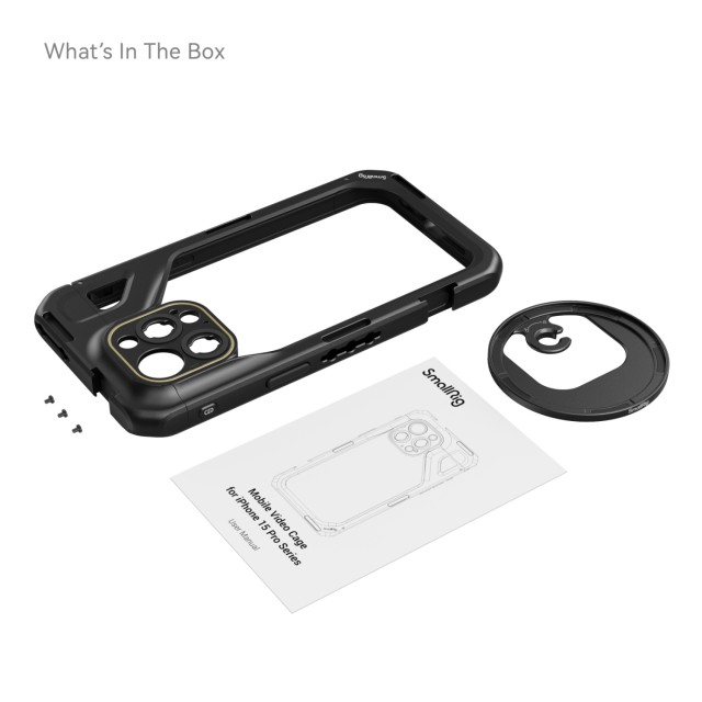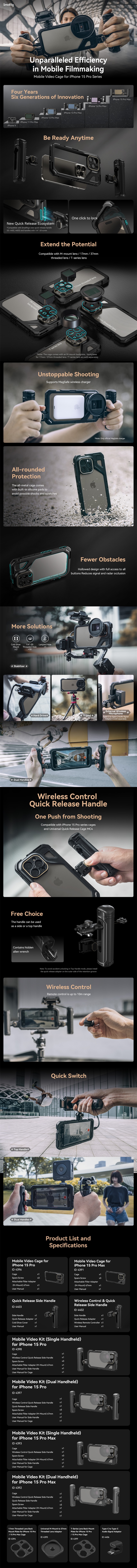 SmallRig Mobile Video Cage za iPhone 15 Pro Max 4391B je večnamenska kletka za mobilni telefon, zasnovana posebej za iPhone 15 Pro Max, ki omogoča snemanje visokokakovostnih videoposnetkov, pretakanje v živo in snemanje vlogov. Kompaktna in oblikovno prilegajoča se kletka tehta le 116 g. Ima luknje z navojem 1/4"-20 in hladne čevlje za pritrditev ročaja, stativa, mikrofona, video luči LED itd, kar je s povsem novim ekosistemom za hitro sproščanje lažje in hitrejše.