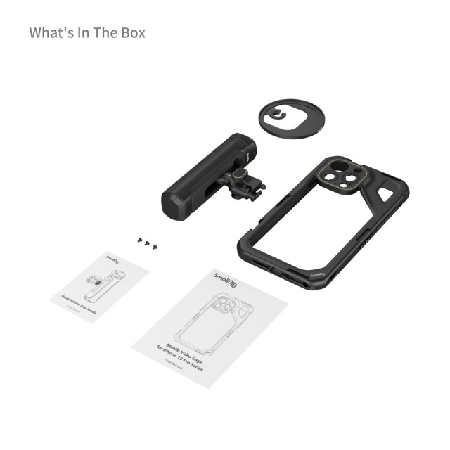 SmallRig Mobile Video Kit (en ročni) za iPhone 15 Pro Max 4393B vključuje eno brezžično krmilno ročico, ki omogoča snemanje z "enim klikom" in zagotavlja stabilno snemanje videoposnetkov in vloganje. Kletka ima več lukenj z navojem 1/4"-20 in hladno podnožje za pritrditev ročaja, stativa, mikrofona, video luči LED itd. Vse imajo novo zasnovo SmallRig Quick Release za enostaven in takojšen preklop med snemanjem v vodoravni in navpični orientaciji. Celokovinska polna kletka podpira tudi objektive, kot so objektivi M-mount ali z zamenjavo osnovne plošče objektivi z navojem 17 mm / 37 mm, objektivi Moment serije T. Je subtilno izdolbena, da omogoča popoln dostop do gumbov, vrat, radarja in ultraširokokotnega objektiva iPhona ter brezžičnega polnilnika MagSafe, z vgrajenimi blazinicami, ki preprečujejo morebitne udarce in praske.