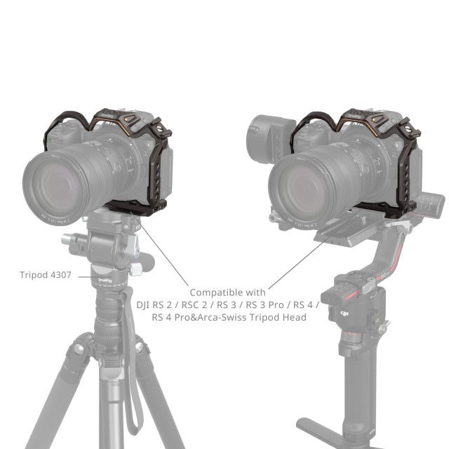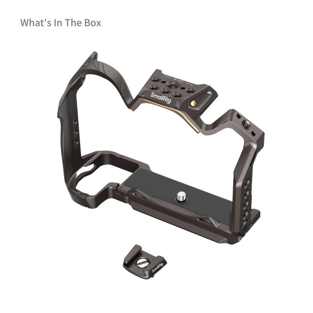 Kletka SmallRig "Night Eagle" za Nikon Z 6III 4521 za zagotavljanje zaščitnega ohišja in vsestranskih možnosti razširitve fotoaparata. Kletko odlikuje sodobna zasnova z elegantnimi krivuljami, subtilnimi zlatimi poudarki in novo kovinsko rjavo barvno shemo. Uporablja tritočkovni sistem zaklepanja, ki Nikon Z 6III pritrdi s spodnjim vijakom 1/4"-20 in dvema vijakoma M2,5 na obeh straneh, vgrajene silikonske blazinice pa fotoaparat varujejo pred praskami. Omogoča neoviran dostop do gumbov, rež za kartice, preklopnega zaslona in prostora za baterijo. Odstranljivo držalo za hladno čeveljc ima na dnu nastavke proti odklonu. Pritrdite ga lahko na stranice in vrh kletke, kar omogoča vsestransko razširitev z mikrofoni, lučmi in drugimi dodatki. Kletka ima različne razširitvene vmesnike, kot so luknje z navojem 1/4"-20, luknje z navojem 3/8"-16 in lokacijske luknje ARRI, združljive s stranskimi držali (ID 2093, 4015), zgornjimi držali (ID 3765), nosilci za monitor (ID 2903, 2904), stativi (ID 3989, 4465), držali za napajalnike (ID 2336) in mini baterijskimi ploščami V-mount (ID 2987). Vgrajene namestitvene luknje 1/4"-20 na straneh omogočajo pritrditev dodatne opreme, kot so objemka za eno palico (ID 3598), magična roka (ID 3873) in stranski ročaj (ID 4346). Na levi strani je vgrajeno vodilo NATO za hitro pritrditev in odstranitev stranskih ročajev (ID 3847, 4017). Kletka ima tudi vgrajene reže za zapestni trak za uporabo z zapestnimi trakovi (ID 3848, 2456) ter vgrajen vmesnik QD, združljiv z ramenskim pasom (ID 4118). Ploščica Arca-Swiss za hitro sproščanje na dnu je združljiva s stativom tipa Arca in kardanskimi obročniki DJI RS 2 / RSC 2 / RS 3 / RS 3 Pro/ RS 4 / RS 4 Pro, kar omogoča enostaven prehod med nastavitvami s kardanskim obročnikom, ročnim prenosnikom in stativom. Poleg tega ploščati ključ z dvema glavama na podstavku poenostavi montažo in demontažo.