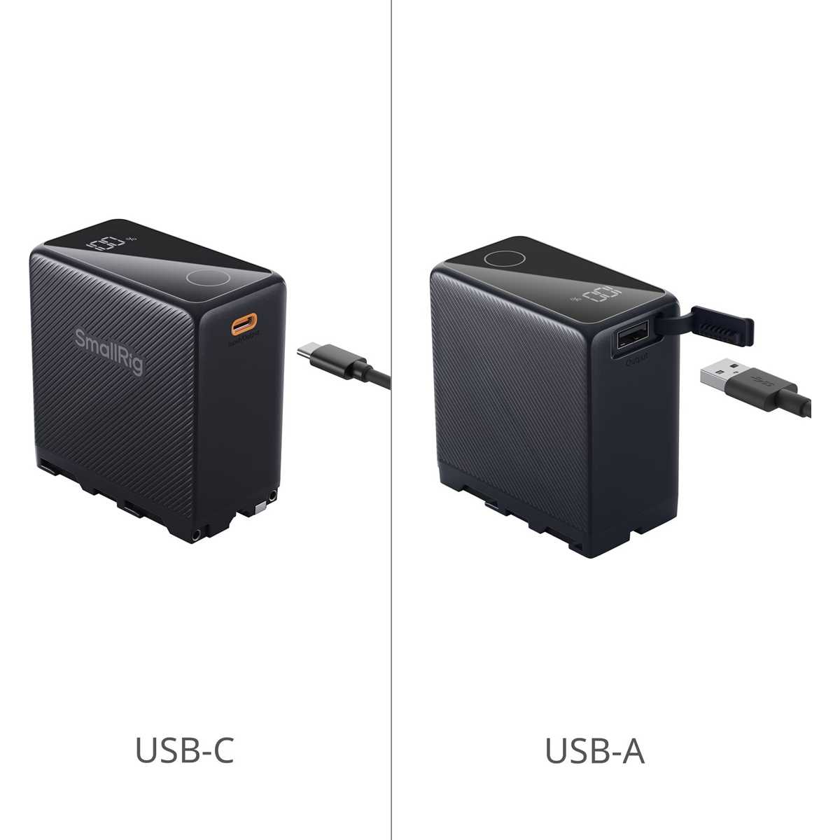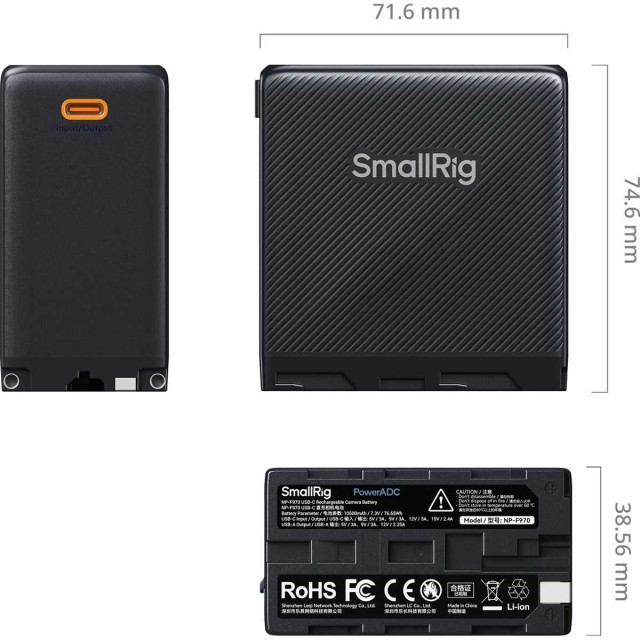 SmallRig NP-F970 USB-C akumulatorska baterija za fotoaparat je visokozmogljiva, zmogljiva, vsestranska in inteligentna baterija za neposredno polnjenje s kapaciteto 10500 mAh (76,65Wh). Njena velika zmogljivost zagotavlja dolgotrajno napajanje in izpolnjuje potrebe po energiji med fotografiranjem. Glavna vrata na dnu baterije lahko napajajo različne naprave, kot so fotoaparati, video luči LED, monitorji, motorizirani drsniki in druge. Opremljena je tudi z enim priključkom USB-C in enim priključkom USB-A, ki omogočata polnjenje elektronskih naprav, kot so pametni telefoni, tablični računalniki in druge elektronske naprave. Priključek USB-C deluje kot vhod in izhod, njegova največja moč pa je 36 W. Polnjenje baterije prek vrat USB-C traja le 3,5 ure, kar omogoča učinkovito ustvarjanje. Vrata USB-A zagotavljajo izhodno funkcijo z največjo močjo 27 W, kar bateriji z različnimi vmesniki doda več funkcionalnosti. Vrata USB-C in USB-A imata vzporedna vezja, kar omogoča hkratno hitro polnjenje dveh naprav. Ta baterija je opremljena tudi z gumbi na dotik in zaslonom za prikaz stanja baterije, ki zagotavlja natančne informacije o stanju baterije za enostavno spremljanje stanja baterije v vsakem trenutku. Te baterije odlikuje inovativna mešanica vrhunske tehnologije in elegantnih oblikovnih elementov, saj imajo barvito zunanjo obliko, ki povečuje njihovo vizualno privlačnost. Poleg tega ima ta baterija visokokakovostne baterijske celice in inteligentne upravljalne čipe ter je opremljena s številnimi zaščitnimi funkcijami za vaša ustvarjalna prizadevanja.