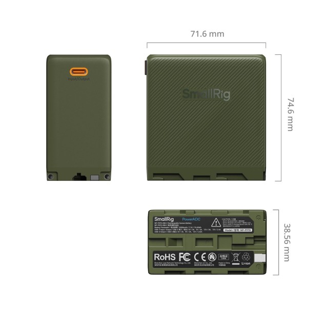 SmallRig NP-F970 USB-C akumulatorska baterija za fotoaparat je visokozmogljiva, zmogljiva, vsestranska in inteligentna baterija za neposredno polnjenje s kapaciteto 10500 mAh (76,65Wh). Njena velika zmogljivost zagotavlja dolgotrajno napajanje in izpolnjuje potrebe po energiji med fotografiranjem. Glavna vrata na dnu baterije lahko napajajo različne naprave, kot so fotoaparati, video luči LED, monitorji, motorizirani drsniki in druge. Opremljena je tudi z enim priključkom USB-C in enim priključkom USB-A, ki omogočata polnjenje elektronskih naprav, kot so pametni telefoni, tablični računalniki in druge elektronske naprave. Priključek USB-C deluje kot vhod in izhod, njegova največja moč pa je 36 W. Polnjenje baterije prek vrat USB-C traja le 3,5 ure, kar omogoča učinkovito ustvarjanje. Vrata USB-A zagotavljajo izhodno funkcijo z največjo močjo 27 W, kar bateriji z različnimi vmesniki doda več funkcionalnosti. Vrata USB-C in USB-A imata vzporedna vezja, kar omogoča hkratno hitro polnjenje dveh naprav. Ta baterija je opremljena tudi z gumbi na dotik in zaslonom za prikaz stanja baterije, ki zagotavlja natančne informacije o stanju baterije za enostavno spremljanje stanja baterije v vsakem trenutku. Te baterije odlikuje inovativna mešanica vrhunske tehnologije in elegantnih oblikovnih elementov, saj imajo barvito zunanjo obliko, ki povečuje njihovo vizualno privlačnost. Poleg tega ima ta baterija visokokakovostne baterijske celice in inteligentne upravljalne čipe ter je opremljena s številnimi zaščitnimi funkcijami za vaša ustvarjalna prizadevanja.