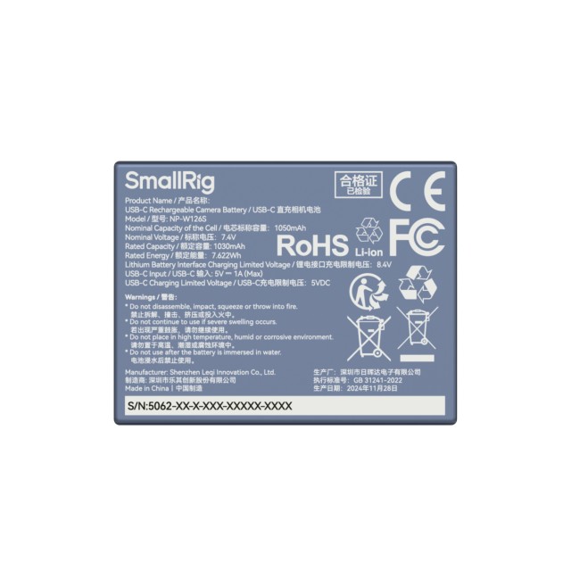 SmallRig NP-W126S USB-C akumulatorska baterija za fotoaparat 5062 omogoča polnjenje prek napajalne banke, traku, avtomobilskega polnilnika ali drugih posebnih polnilnikov. Z visokotokovnim polnjenjem (5 V 1A) in nazivno zmogljivostjo 1050 mAh lahko baterijo napolnite v 2,5 urah in deluje dlje časa. Ta vizualno prepoznavna baterija, ki je v celoti dekodirana brez pojavnih oken, ima matirani lupini ABS in PC, ki sta odporni na ogenj in vzdržljivi. Je popolnoma enake velikosti kot originalna baterija fotoaparata, zato ni skrbi, da bi se zataknila.