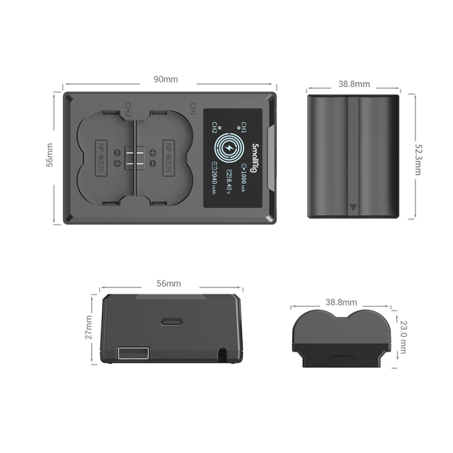 Komplet baterij in polnilnika SmallRig NP-W235 3822 vsebuje dve bateriji in en polnilec. Baterija ima popoln dekodirni čip, odlično podpira različne fotoaparate, ne da bi povzročala pokanje, in ima visokokakovostno ognjevarno lupino iz ABS in matiranega osebnega računalnika, ki zagotavljata mehak dotik in vzdržljivost. Je enake velikosti kot originalna baterija, zato se brez težav prilega v predalček za baterije. Dvojni polnilec lahko hkrati polni dve bateriji, LCD-zaslon pa v realnem času prikazuje polnilno napetost, tok in napolnjeno zmogljivost. Ima vgrajen polnilni kabel USB-A in vhodni vmesnik USB-C, ki omogoča polnjenje prek adapterja USB, avtomobilskega polnilnika ali napajalne banke.