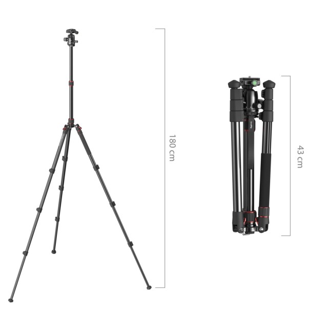 Z največjo delovno višino 180 cm / 71 palcev ta stativ omogoča različne perspektive snemanja, hkrati pa se zloži na kompaktno dolžino 43 cm / 16,9 palca. Teža le 1,56 kg / 3,4 lb ga naredi lahkega in enostavnega za prevoz. 360° kovinska kroglica zagotavlja robustno stabilnost, trdne noge iz aluminijeve zlitine pa nosijo do 15 kg / 33,1 lb (5 kg / 11 lb za glavo).