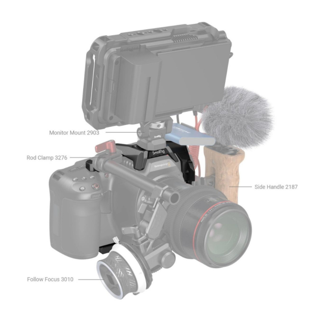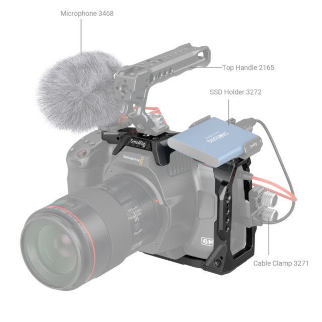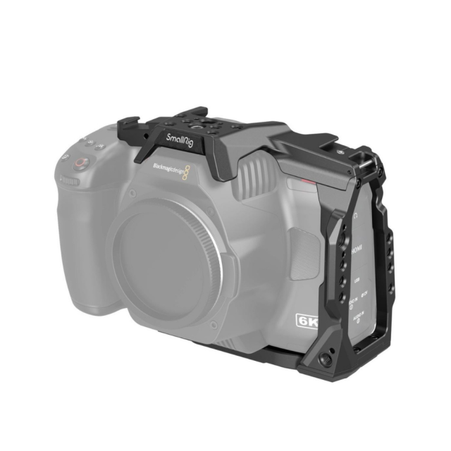 Polkletka SmallRig za kamero BMPCC 6K Pro 3665 zagotavlja pritrdilne točke za dodatno opremo, ki olajša snemanje. Kamera se pritrdi z enim 1/4" vijakom na vrhu in dvema na dnu, da se prepreči zvijanje. Na vrhu so luknje z navojem 1/4'-20 za nosilec monitorja BSE2294, luknje za pozicioniranje 3/8"-16 za nosilec za pozicioniranje ARRI 2165 ter hladni čevlji za mikrofone, luči LED, nosilec SSD 3272 itd. Njegova leva stran je opremljena s tirnico NATO za vrtljivo držalo NATO 3260 in držalo NATO 2270 ter luknjami z navojem 1/4''-20 za objemko za kabel HDMI in USB-C 3271 za zagotavljanje stabilnega prenosa podatkov; desna stran je primerna za originalno držalo kamere. Na sprednji strani kletke je ena luknja 1/4''-20 na vrhu in ena luknja 1/4''-20 na dnu za pritrditev objemke za drog 3276. Osnovna plošča vsebuje luknji z navojem 1/4''-20 in 3/8'-16 za plošči za hitro sproščanje 1280 in 2146 ter razširjeno ploščo za hitro sproščanje DJI RS 2 in imbusni ključ za lažji dostop. Vgrajene silikonske blazinice lahko preprečijo nastanek prask. Poleg tega so na voljo tudi luknje za namestitev ramenskega ali zapestnega traku. Kletka se brezhibno prilega fotoaparatu in ohranja dostop do gumbov, rež za kartice in odprtin.