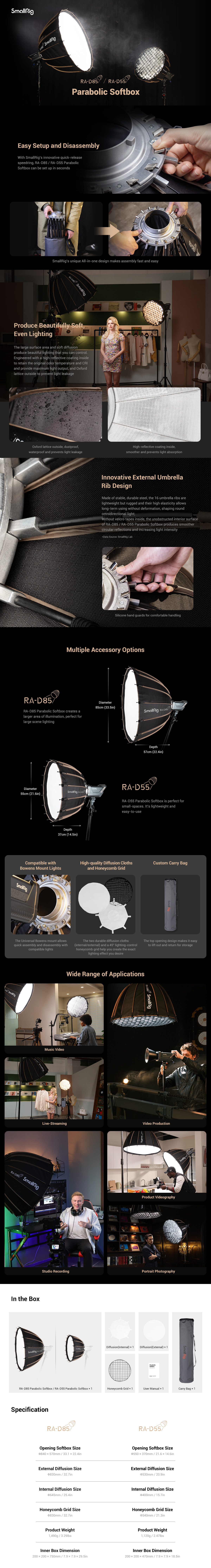 Parabolični softbox SmallRig RA-D85 3586 je univerzalna dodatna oprema s premerom 85 cm. Zaradi univerzalne zasnove z nastavkom Bowens je združljiv z napravami SmallRig RC 120D/RC 120B/RC 220D/RC220B in drugimi lučmi z nastavkom Bowens. Zaradi nove zasnove s hitrim sproščanjem lahko kupolo enostavno namestite in odstranite v 15 sekundah.