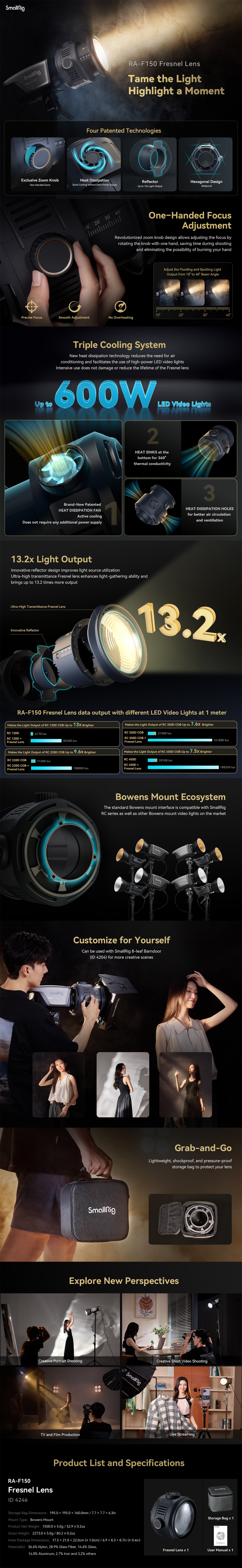 SmallRig RA-F150 Fresnelov objektiv 4246 je profesionalni nastavek za ostrenje. Omogoča natančnejše zalivanje in usmerjanje svetlobe na določen predmet ali prizorišče. Inovativna zasnova visokoprepustne Fresnelove leče s premerom 150 mm in vgrajenim reflektorjem prinaša 10-krat večjo moč. Inovativna zasnova povečave/pomanjšave omogoča prilagajanje ostrenja z eno samo roko, kar prihrani čas med fotografiranjem in odpravi možnost pregretja roke. Z vrtenjem gumba za ostrenje lahko spreminjate kot svetlobnega snopa od 10° do 40°. Standardni vmesnik za nastavek Bowens je združljiv s svetilkami SmallRig RC120/220/350/450 in drugimi svetilkami z nastavkom Bowens na trgu. Ta Fresnelova leča lahko deluje tudi z osemlistnimi svetilkami SmallRig Barndoors, s katerimi lahko ustvarite več svetlobnih učinkov.